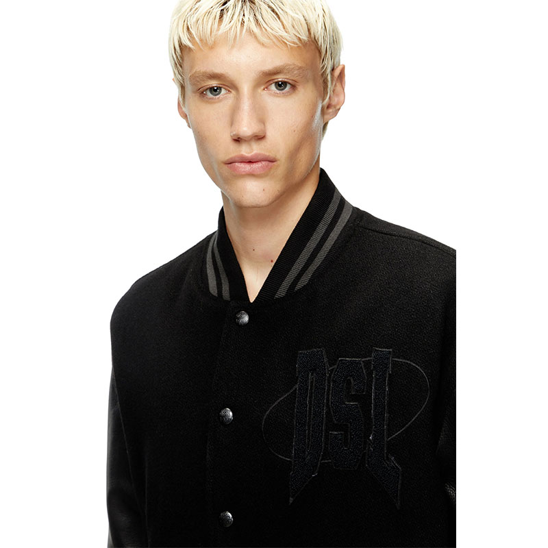 Men's cotton bomber jacket, featuring leather sleeves and striped ribbed trims. Varsity logo motifs on the chest and back add a tactile note.
