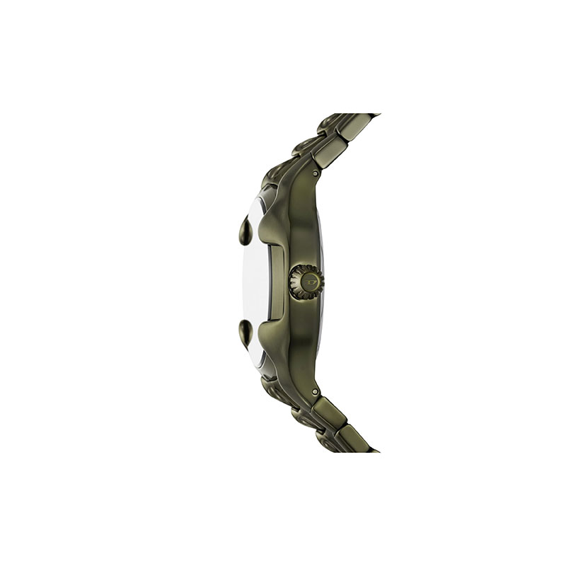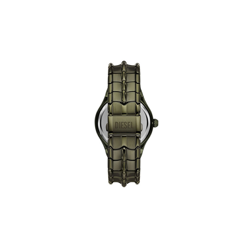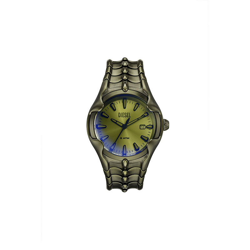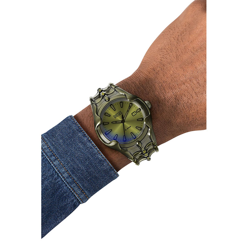 Diesel's 45 44mm Vert watch features a green iridescent crystal, silver sunray dial, three-hand date movement and green stainless steel bracelet.
