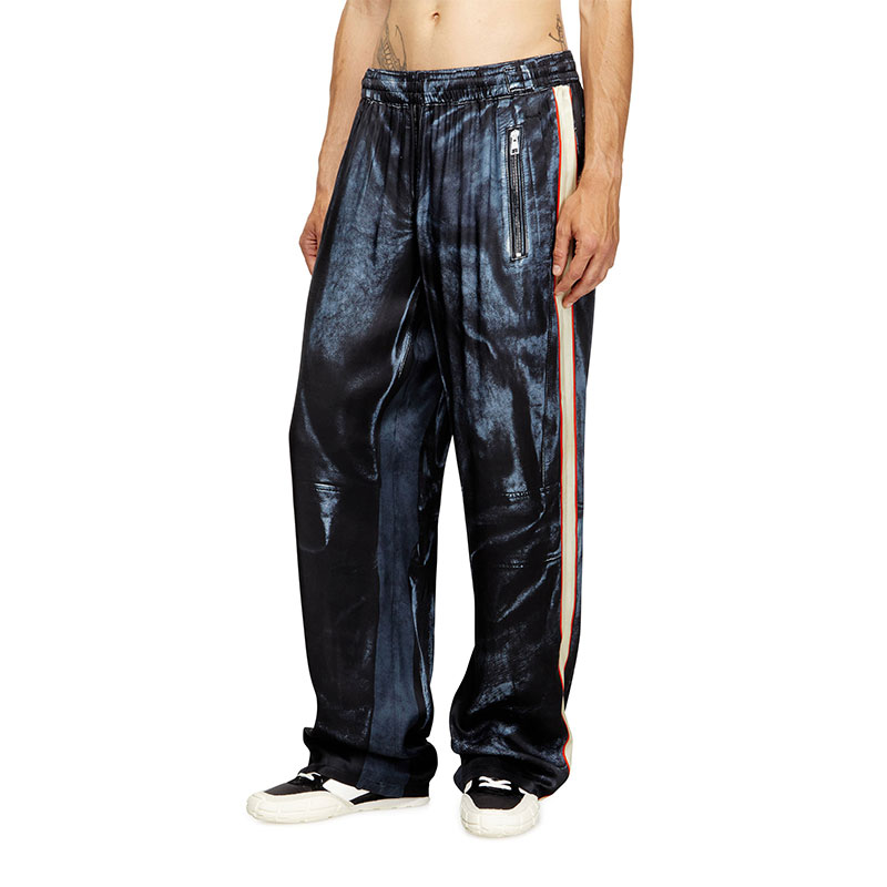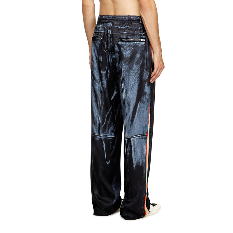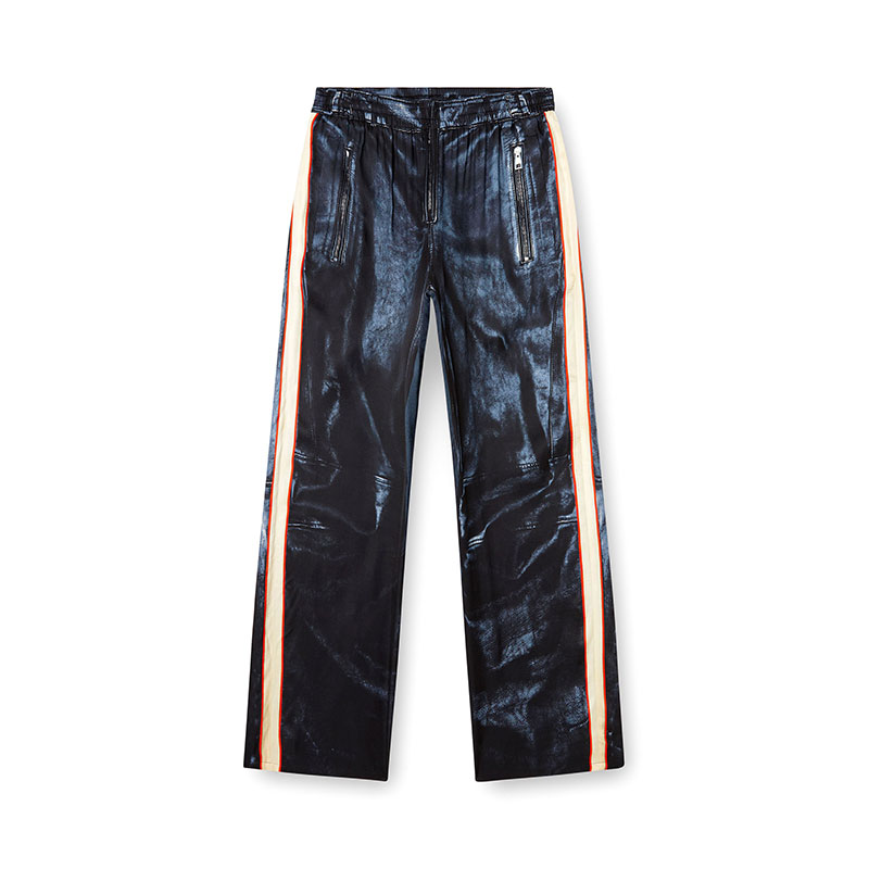 These men's fluid trousers are cut from viscose containing half and half responsibly-sourced and ECOVERO fibres. Despite fitting like joggers, they look like worn-in black leather biker pants with a trompe l'oeil print — note the zips, panelling and contrast side bands.