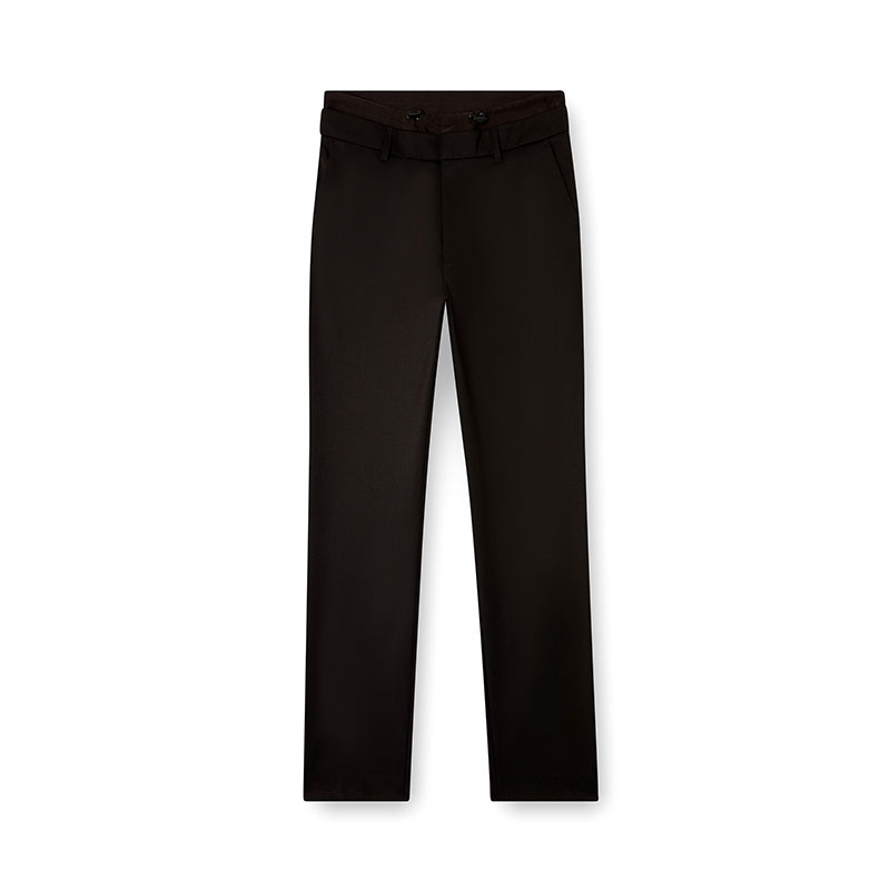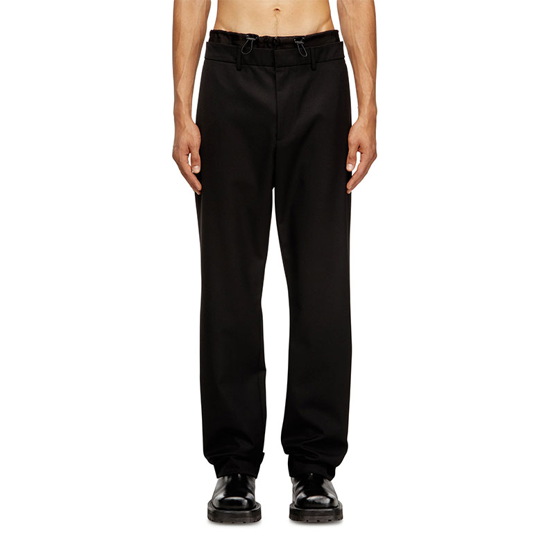 Regular fit wool blend trousers. They feature a comfortable elastic waistband with contrasting nylon belt and drawstring closure, complemented by a zipper, a four-hole button, and an internal hook. The front pockets and the welt pockets on the back add an elegant touch, further enhanced by the back metal plate with Oval D logo.