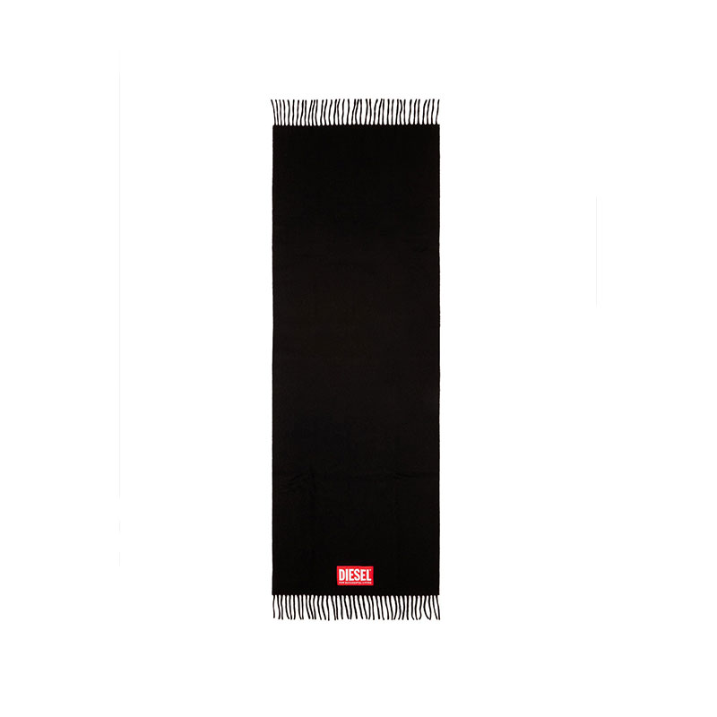 This classic men's wool jacquard scarf is finished with long fringe trims. A Diesel for Successful Living logo patch is placed at the bottom.