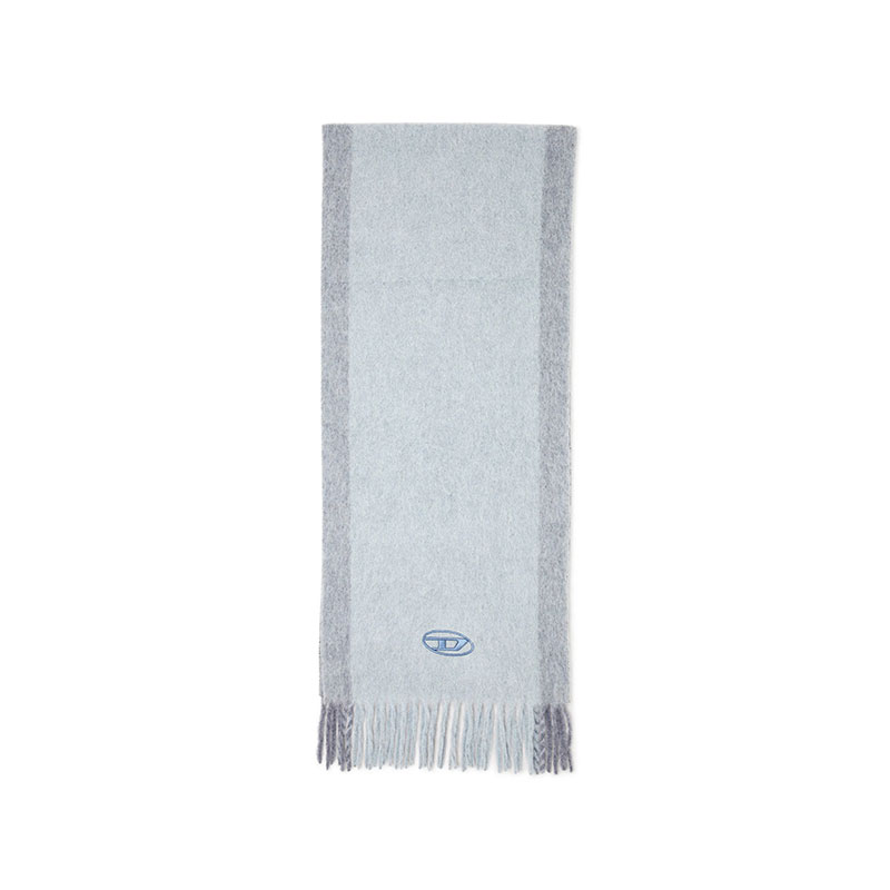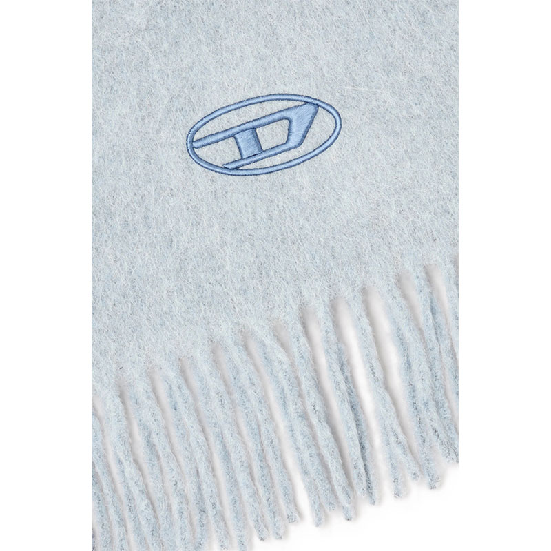Scarf in a soft wool blend with a plush jacquard texture, featuring tonal borders along the length and classic fringed edges. The design is completed by an Oval D logo embroidered near the edge, adding a subtle Diesel signature detail.