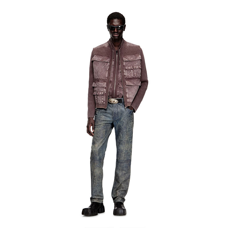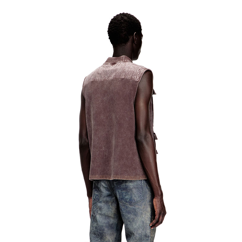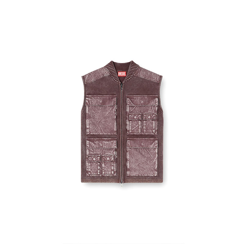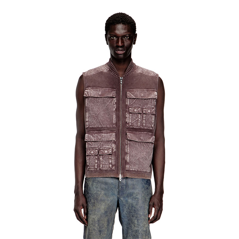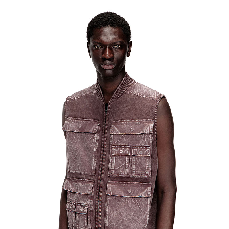Men’s knitted vest in organic cotton. Not a far cry from tactical gear, this utilitarian style has a ribbed bomber collar and a zip-fastening front stacked with oversized cargo pockets. This garment is made up of both knitted and woven fabrics and dyed post-construction, resulting in subtle tonal variations and rugged ease.