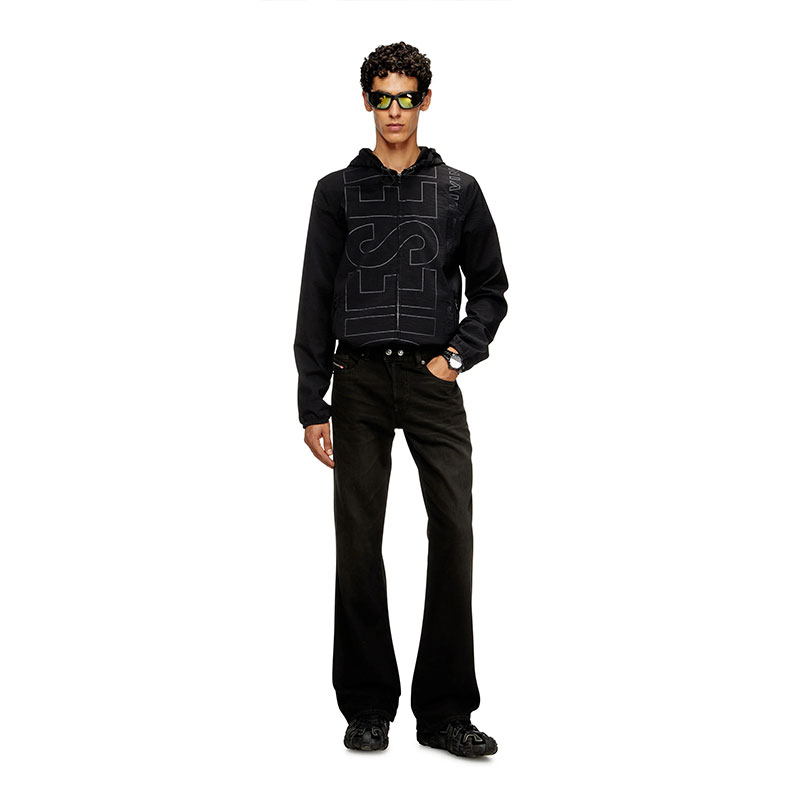 Bootcut fit with a medium waist, low crotch, and regular leg. The extra-long silhouette has a slightly flared hem and is detailed with an embroidered "D". Button fly.