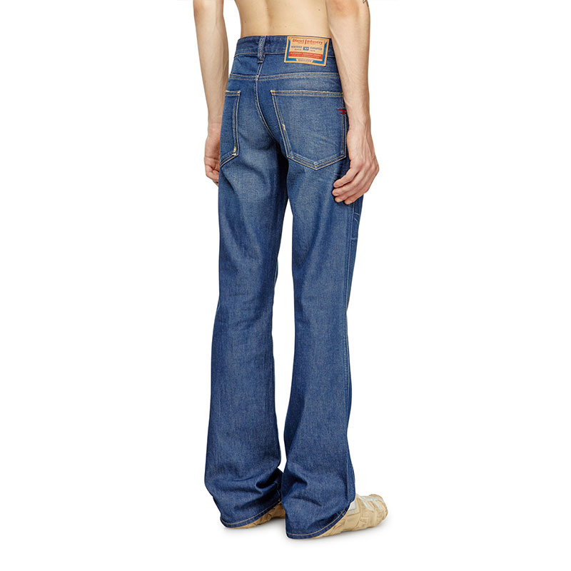 Bootcut fit with a medium waist, low crotch, and regular leg. The extra-long silhouette has a slightly flared hem and is detailed with an embroidered "D". Button fly.