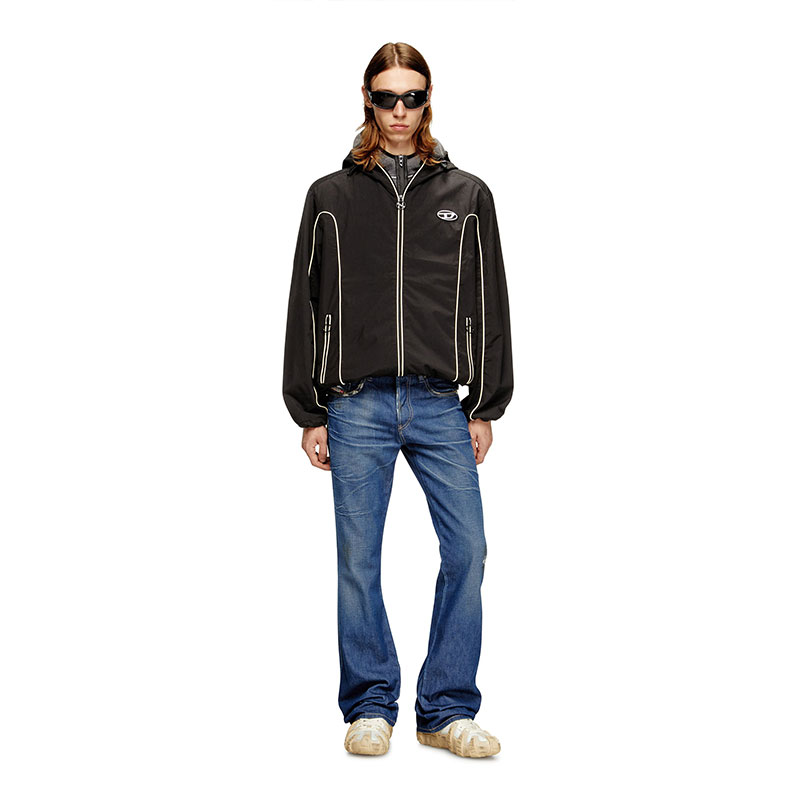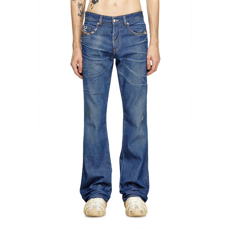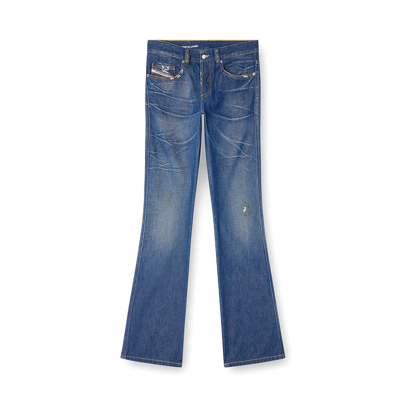 This fix denim is made using organic cotton and recycled polyester fibres. The dark blue wash embodies Diesel's DNA through Distressed in Italy treatments, including 3D whiskers and localised dirt effects.