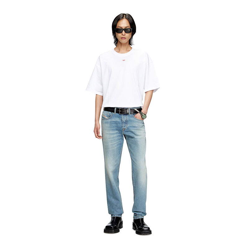 The comfort denim fabric is crafted using partially recycled cotton, and features a light blue wash with subtle treatments that channels an authentic, lived-in look. It's part of Diesel's DNA selection of essential and iconic washes.