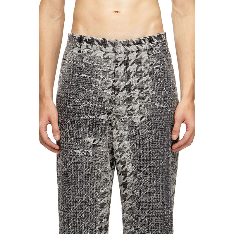 Distressed in Italy, this black fix denim features a distinctive jacquard weave with a double pattern: the houndstooth top layer is burned using a precise laser process to reveal the Prince of Wales motif underneath. Stonewashed with enzymes, this unique worn-in wash is part of the Runway line up, channelling an unconventional haute-couture attitude.
