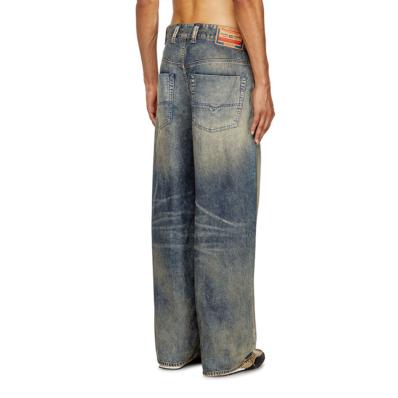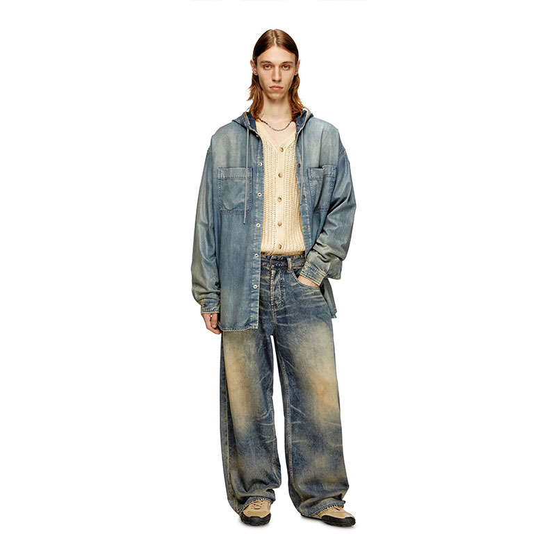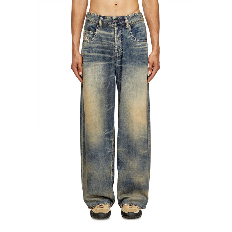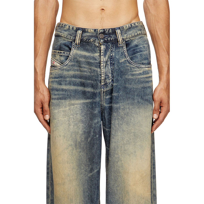 This medium blue wash reinterprets Diesel's heritage coating with a subtle, contemporary twist. The fix denim base is made from a fluid Lyocell and Modal blend, stone washed and treated with bleach effects for a marbled finish. A special transparent film is pressed on the fabric, creating an extremely refined, soft coated finish.