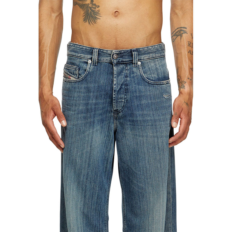 Crafted using regenerative cotton, this fix denim showcases a bold streaky effect, enriched by whiskering and small abrasions for a distinctive worn look.