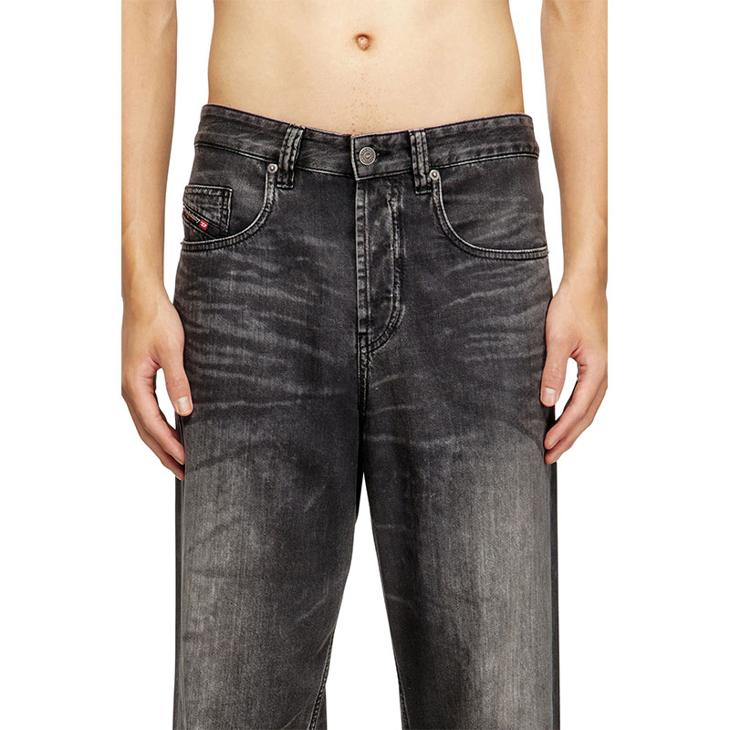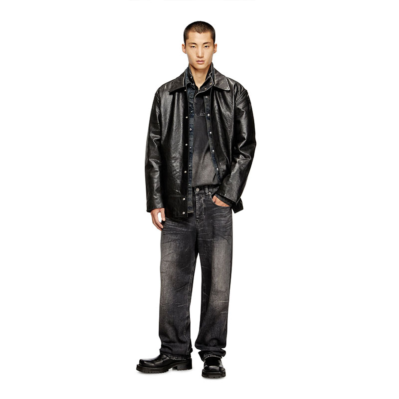 This black wash reinterprets Diesel's heritage coating with a subtle, contemporary twist. The fix denim base is made from a fluid Lyocell and Modal blend, stone washed and treated with bleach effects for a marbled finish. A special transparent film is pressed on the fabric, creating an extremely refined, soft coated finish.