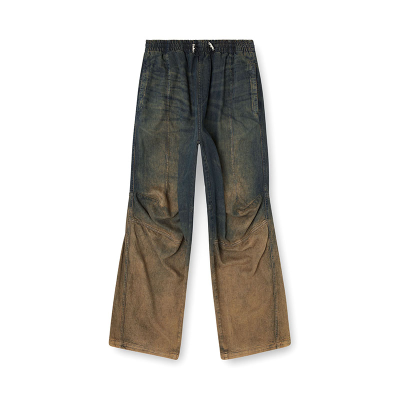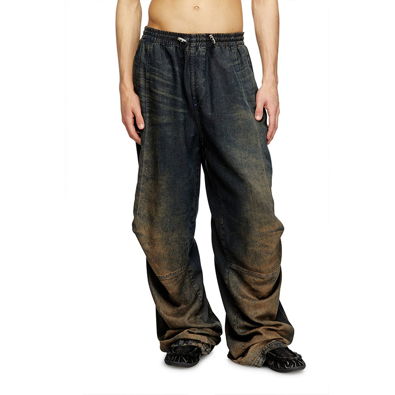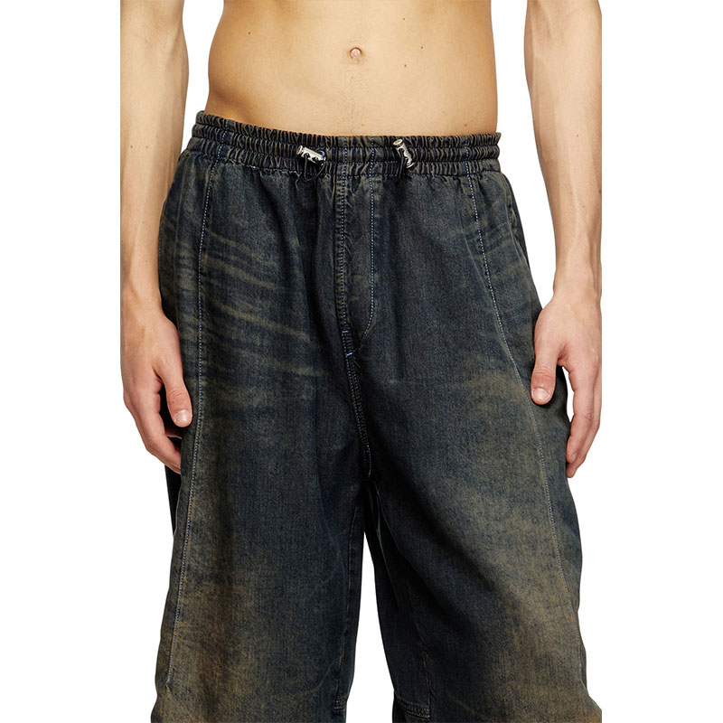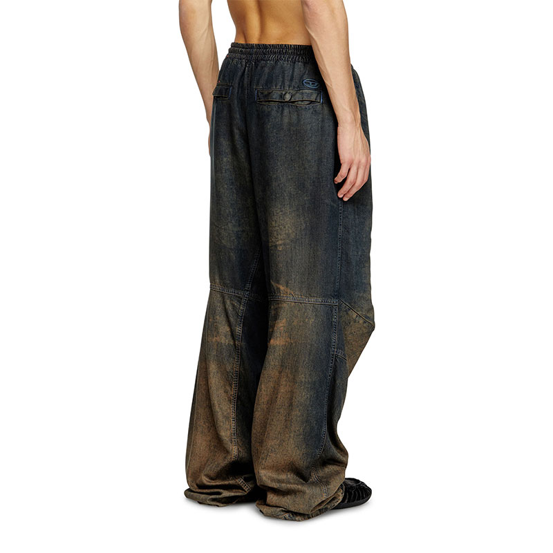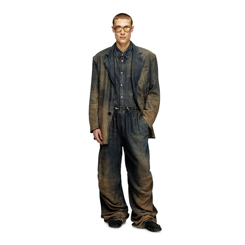 Crafted from dark blue lightweight Tencel Lyocell denim with a fluid texture. The dark blue wash is treated with spray and laser techniques to create a dégradé finish on the hem, enhanced by dirt effects in sandy tones.