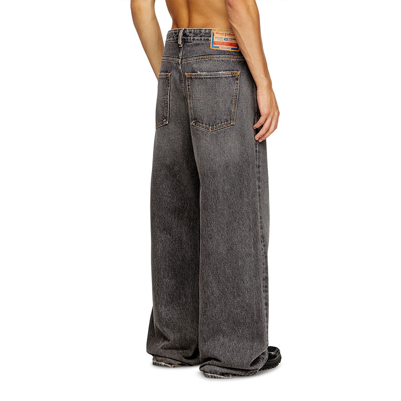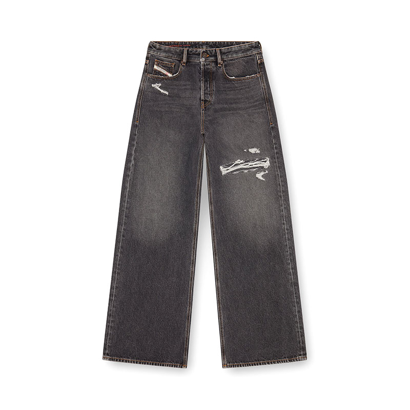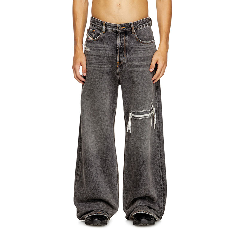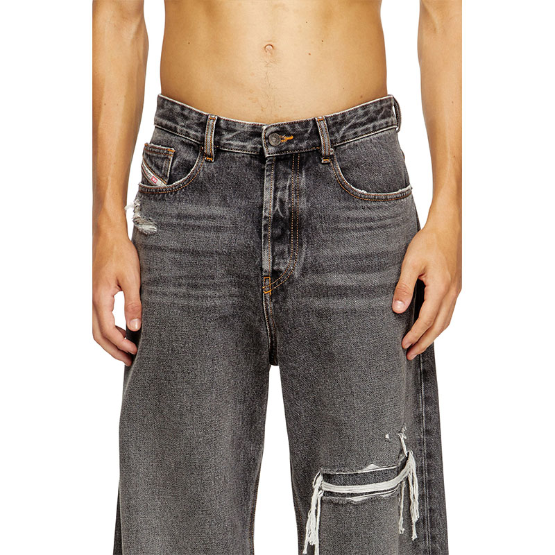 This fix denim delivers a destroyed look. The organic cotton fabric in dark grey is treated with an alternative stonewash technique and detailed with cuts and abrasions.