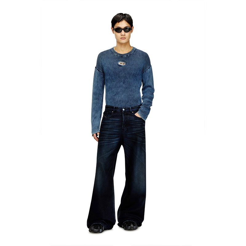 Characterised by intense variations in tone achieved through artisanal treatments, this dark blue wash is part of Diesel's DNA selection, offering an iconic take on the brand's heritage denim. It's made from fix fabric with organic cotton and TENCEL Lyocell, with a soft, fluid fit. Boldly contrasting whiskers are hand-sanded on each garment, while black earth pigments and spray techniques lend a dirt-like finish, enhancing depth and texture.