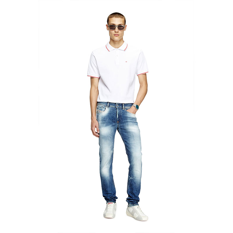 Made from organic-cotton stretch denim, this dark blue wash is Distressed in Italy, and showcases a signature DNA look. Exclusive treatments create the cloudy, bleach-effect contrasts, especially on the thigh.