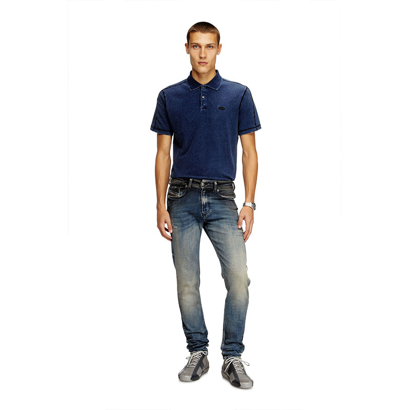 True to Diesel's experimental vision, this medium blue wash showcases innovative binding and dirt techniques that lend the piece depth and character. Crafted from stretch denim in organic cotton, it features hand-sanded whiskers and manual abrasions, with each rip carefully hand-trimmed for a cleaner finish. A black pigment spray creates a unique smudged effect. Finished with a real leather back patch, it’s part of the DNA selection of iconic and heritage washes.