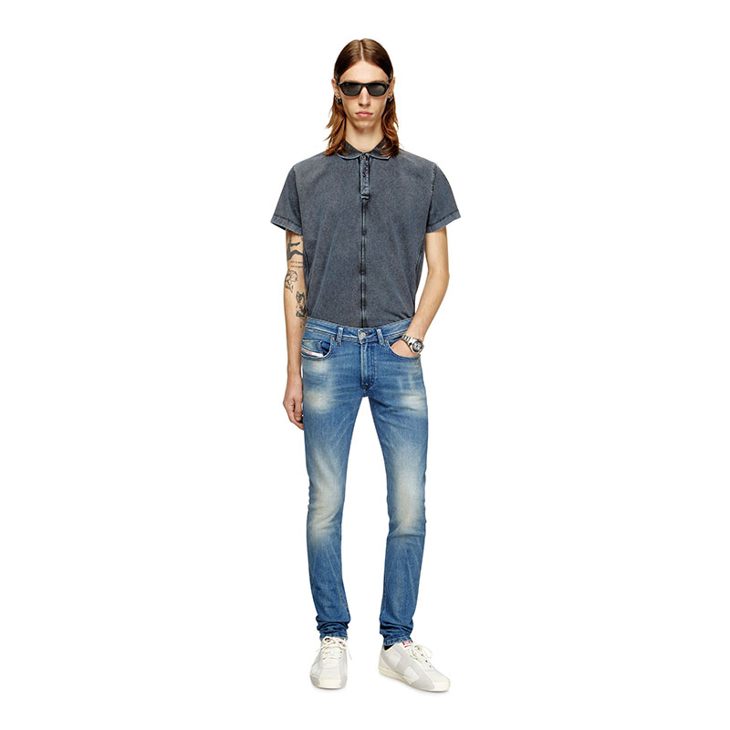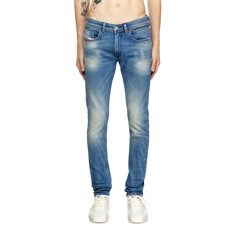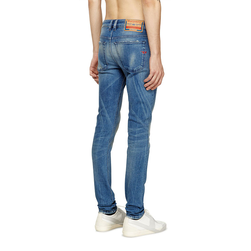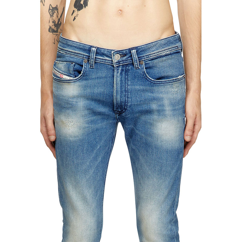This stretch denim features a medium blue wash with used effects in a lighter shade, emphasised by subtle abrasions. It's part of Diesel's DNA selection.