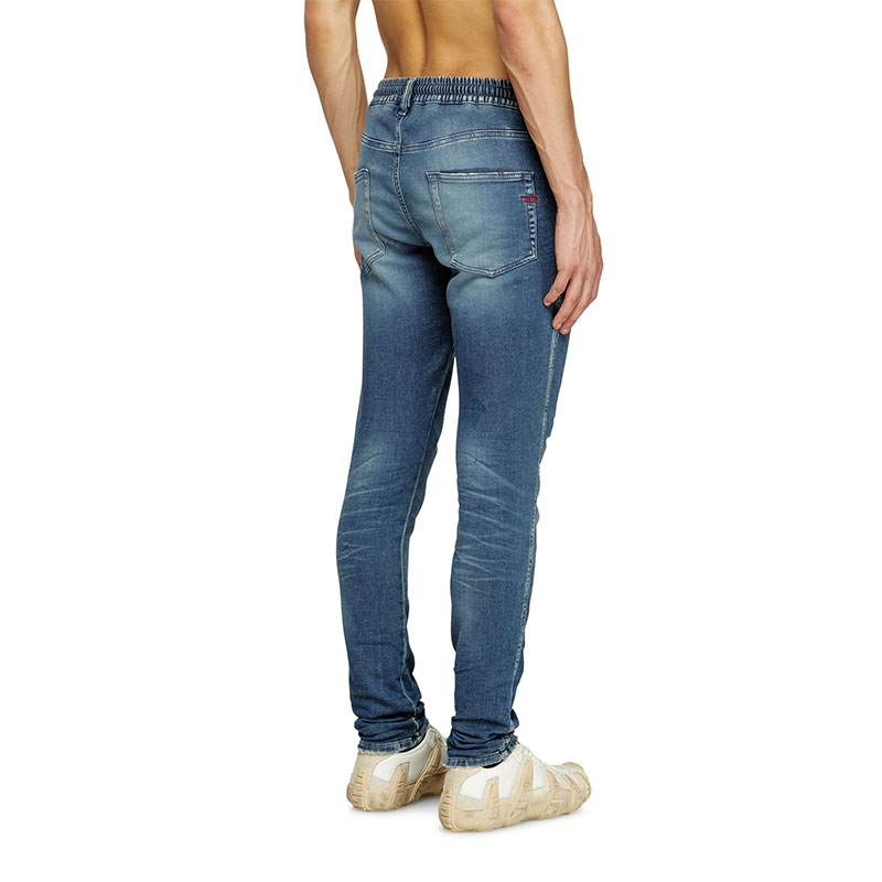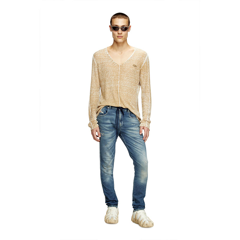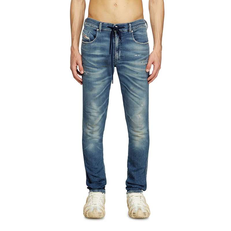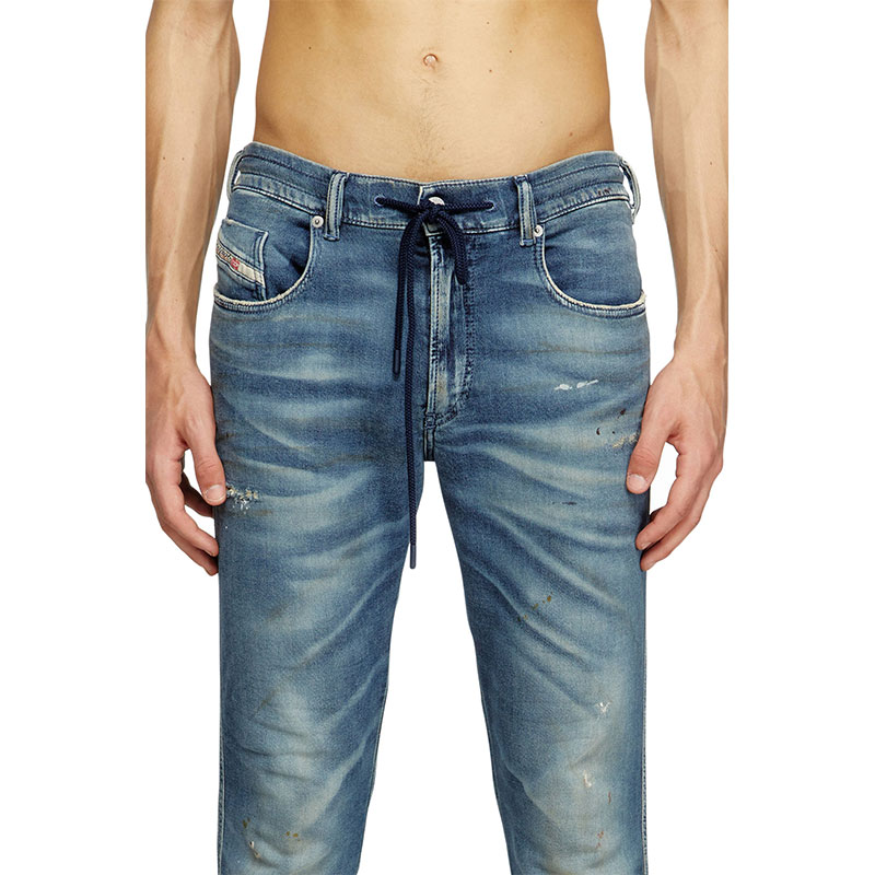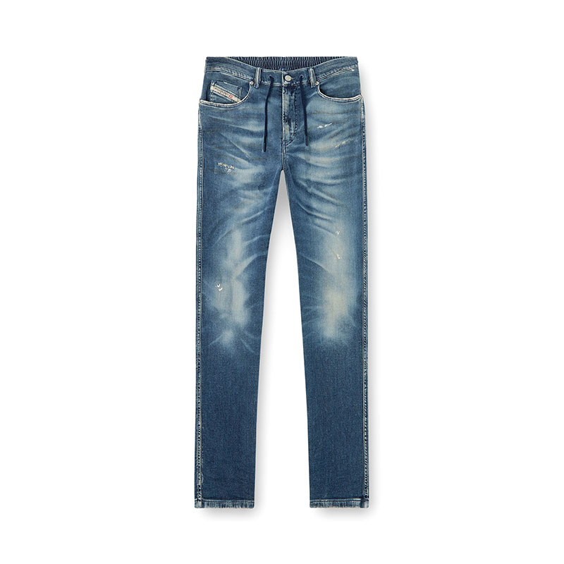 This dark blue wash channels a lived-in feel, defined by whiskering with dirt-effect streaks, spots of colour, and subtle abrasions. It belongs to Diesel's DNA selection of iconic and essential washes.