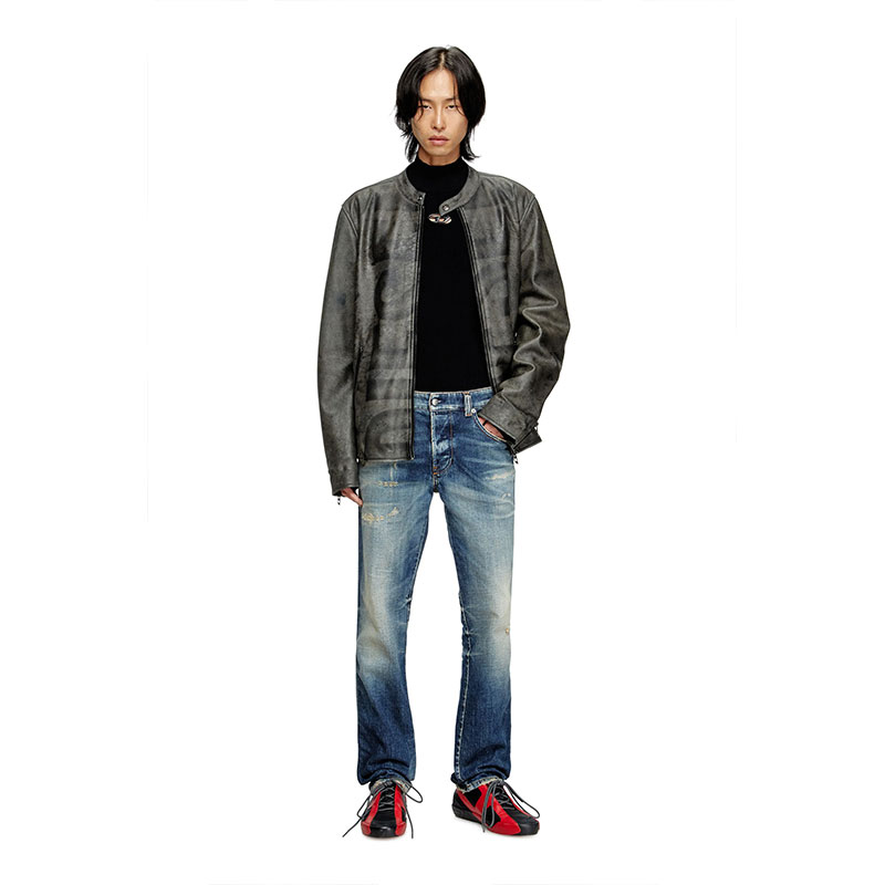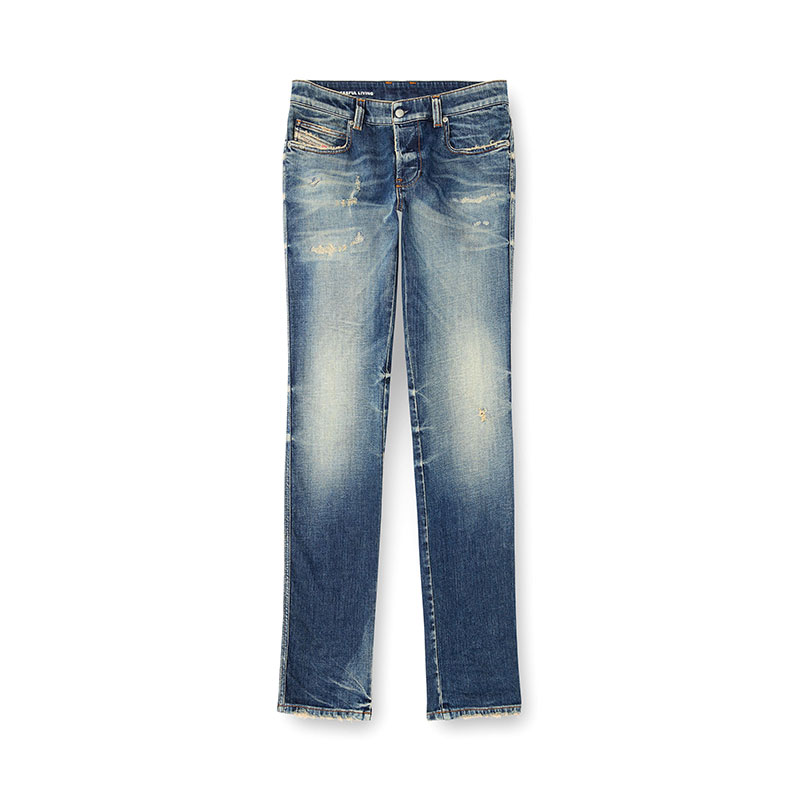 Tapping Diesel's signature destroyed and dirt-infused aesthetic, this dark blue comfort denim is defined by ripped and repaired abrasions, shaded whiskers, and an overall dusty finish. It's made using a percentage of regenerative cotton.