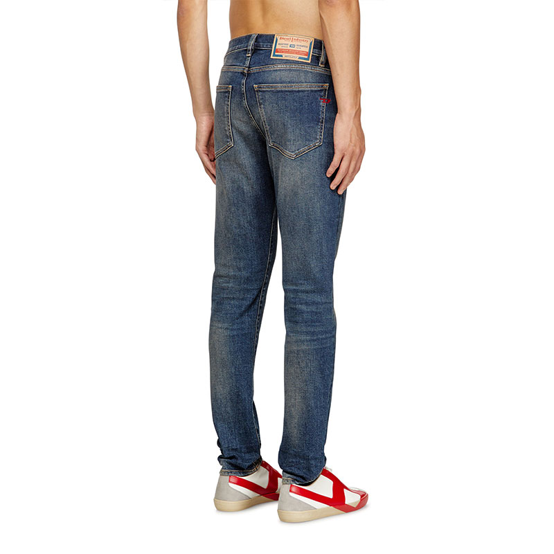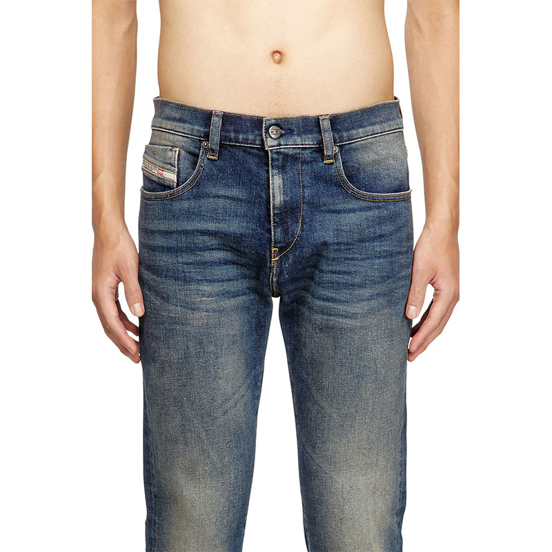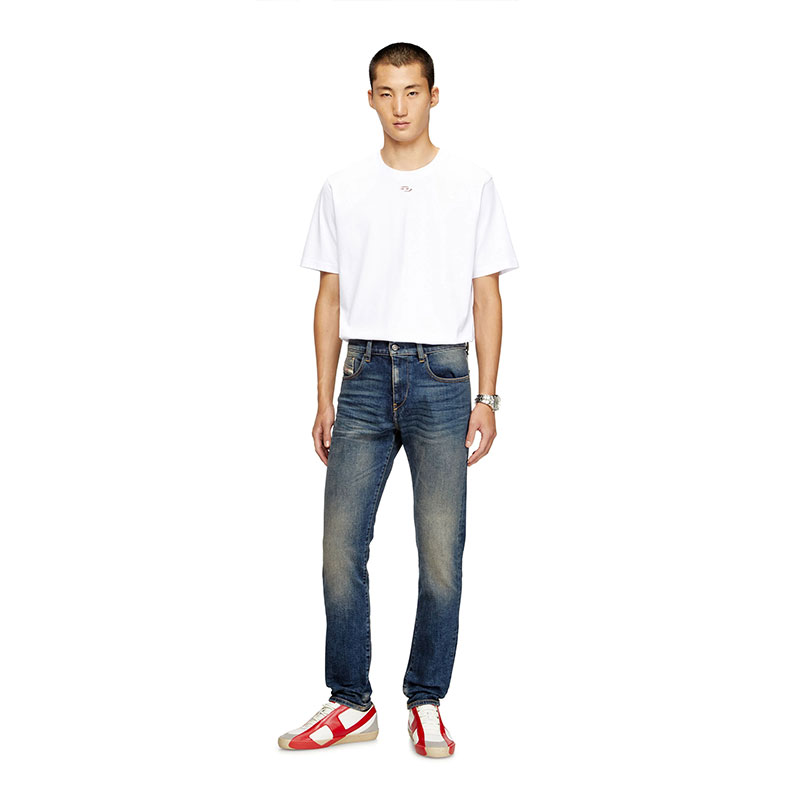 Crafted using regenerative cotton, this comfort denim is lightly treated with whiskers and shaded areas on a dark blue base, delivering an authentic used look.