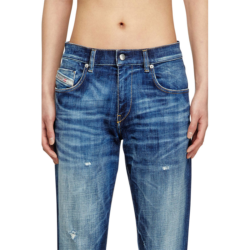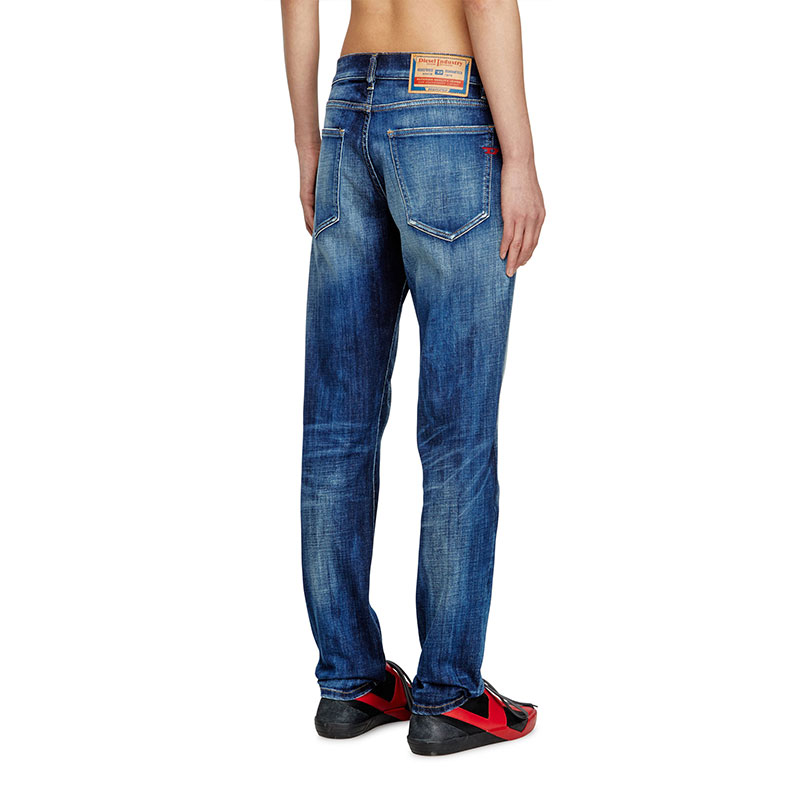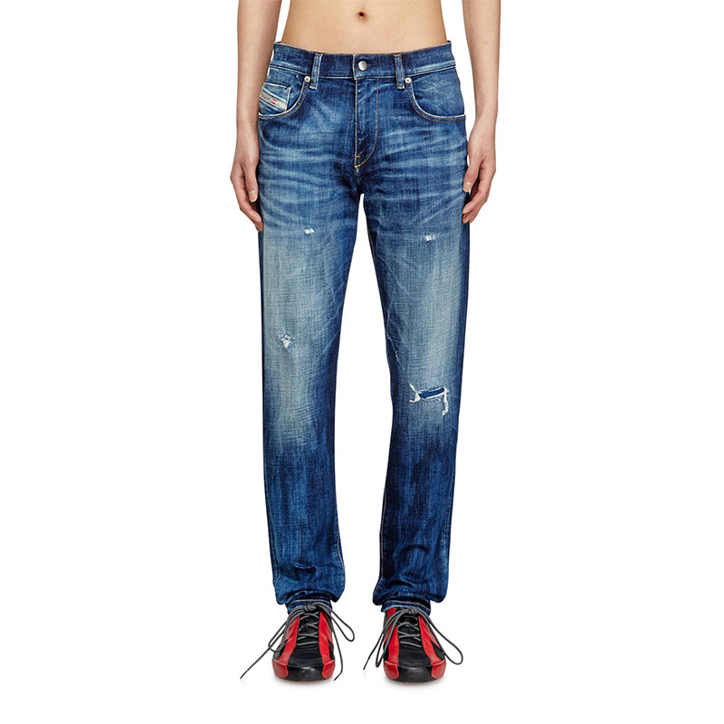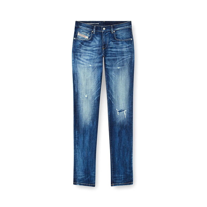 This comfort denim is made using partially recycled cotton. The dark blue wash showcases a signature DNA look, with boldly contrasting whiskers and small abrasions throughout the leg. A ripped and repaired slash on the left knee.