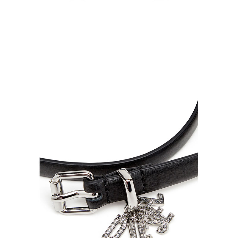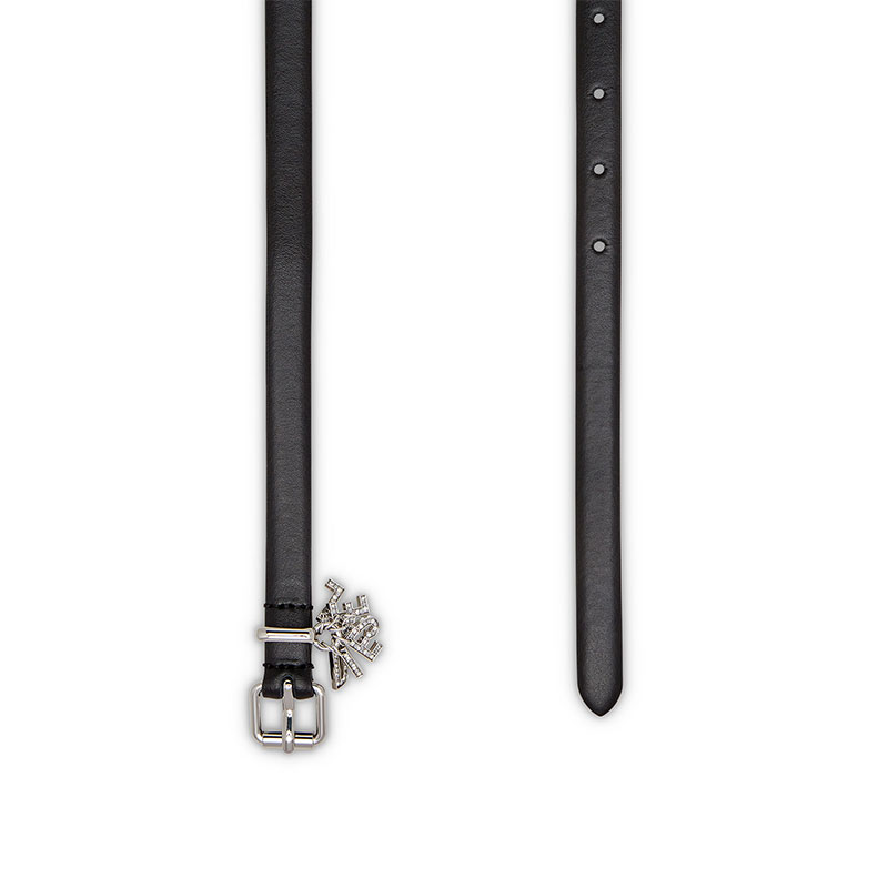 Cut in a slim width, this women’s belt is crafted from responsible leather and fastened with a polished silver roller buckle. The metal logo letter charms dangling from the loop have been bedecked with crystals for a touch of sparkle.
