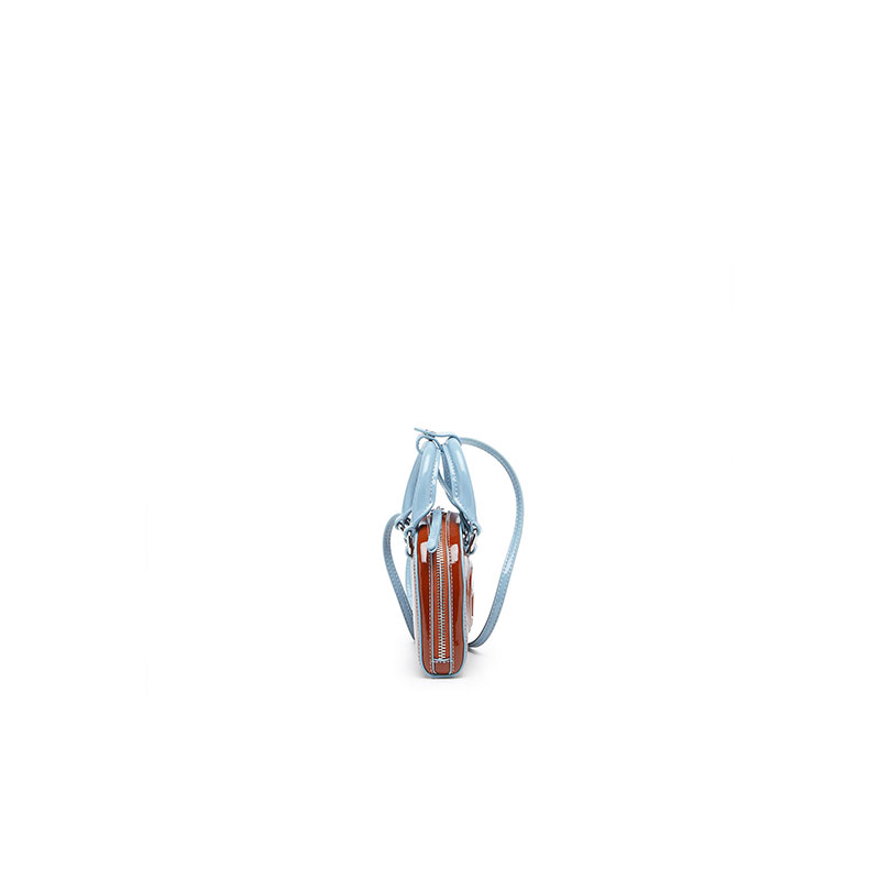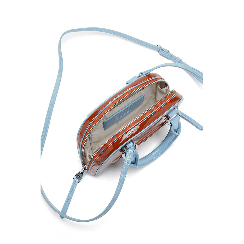 This women’s mini crossbody is a slimmer yet fully functional version of the ‘Dome’ bowling bag evolved from the iconic 1DR. Featuring an adjustable strap and rolled top handles, it embraces a playful colour-block design in PU. The fabric has the distinctive wrinkled texture and patent shine of naplak leather. The zipped compartment – roomy enough for your phone, card holder, keys and lipstick – opens wide, with side gussets keeping everything secure. Up front, an embossed Oval D is as bold as the bag.