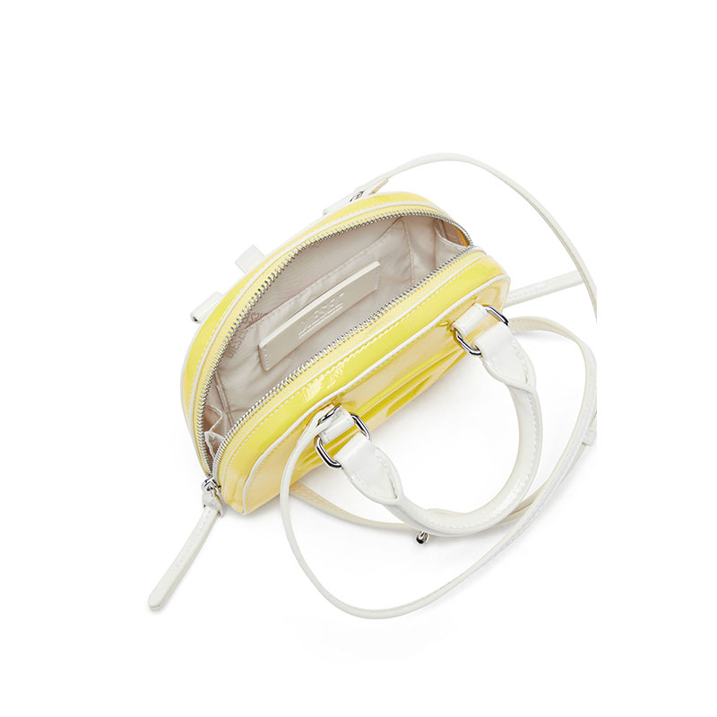 This women’s mini crossbody is a slimmer yet fully functional version of the ‘Dome’ bowling bag evolved from the iconic 1DR. Featuring an adjustable strap and rolled top handles, it embraces a playful colour-block design in PU. The fabric has the distinctive wrinkled texture and patent shine of naplak leather. The zipped compartment – roomy enough for your phone, card holder, keys and lipstick – opens wide, with side gussets keeping everything secure. Up front, an embossed Oval D is as bold as the bag.