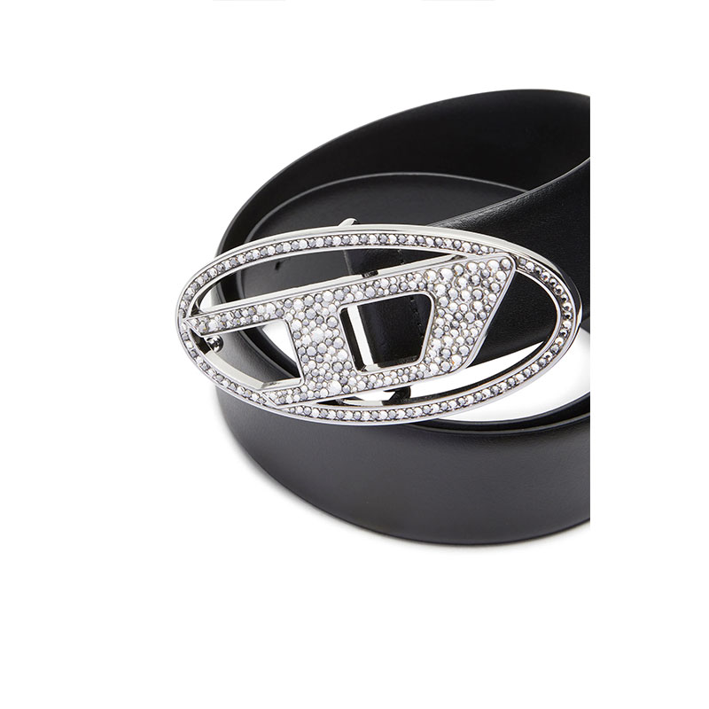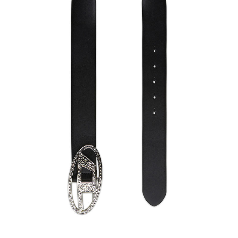Women’s belt crafted from high-quality black leather, fastened with a crystal-encrusted metal Oval D buckle. Width: 4 cm / 1.5 inches.