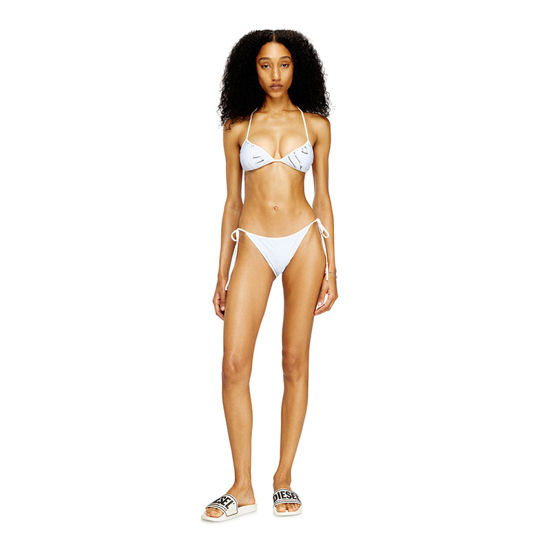 Nylon bikini top with triangle cups. The stretchy fabric adapts to the body and features an all-over houndstooth motif, enriched with a graphic lettering print. Finished with adjustable ties.