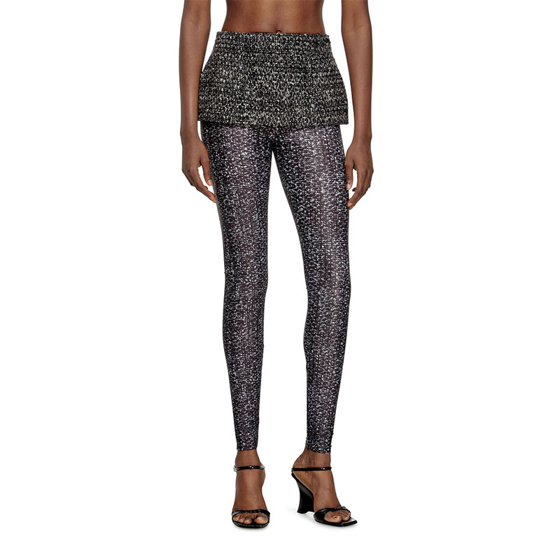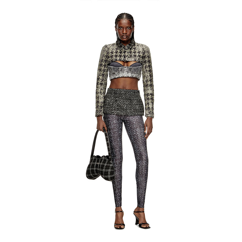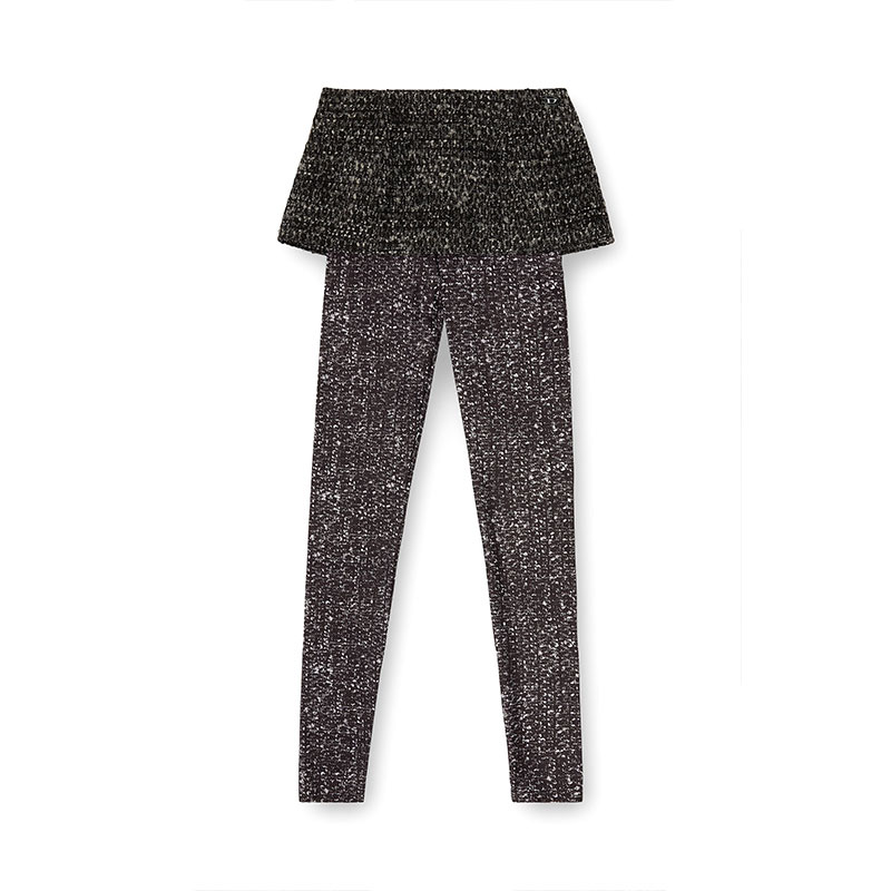 Fusing an impossibly short skirt with full-length leggings, this women's hybrid garment is hot off the Fall Winter 2025 Runway. Real bouclé tweed is paired next to an all-over printed impression on skin-tight Lycra: a seamless juxtaposition of real and trompe l'oeil.