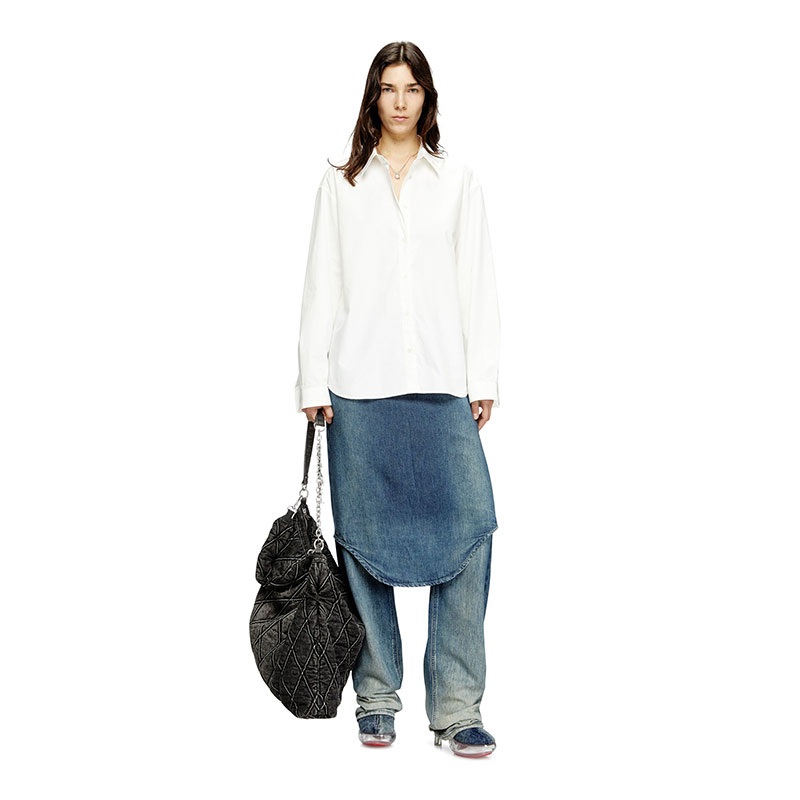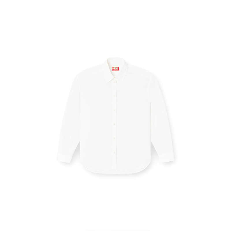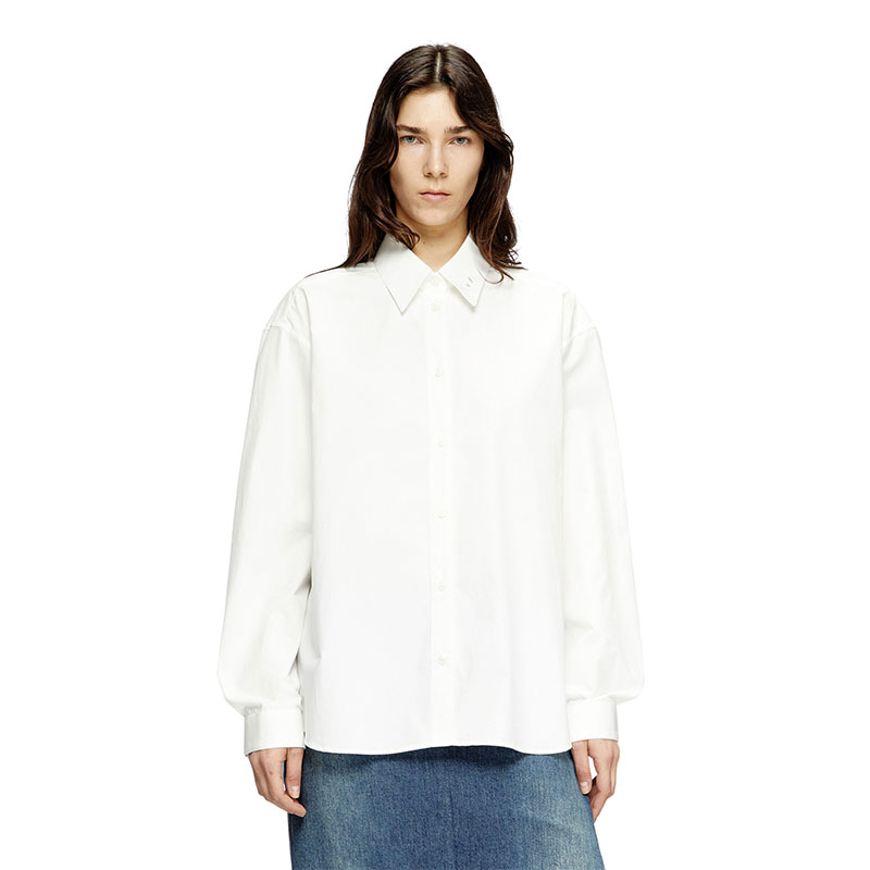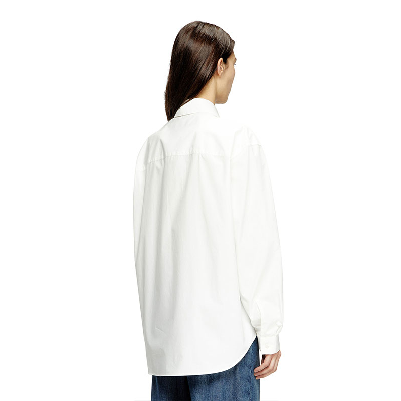 This women's white shirt has a boyfriend feel with its relaxed fit, featuring faux mother-of-pearl buttons with Diesel branding. The compact poplin fabric is made using organic cotton. A tonal embroidered Oval D details the left collar.