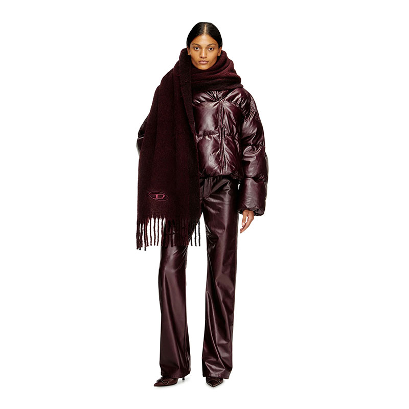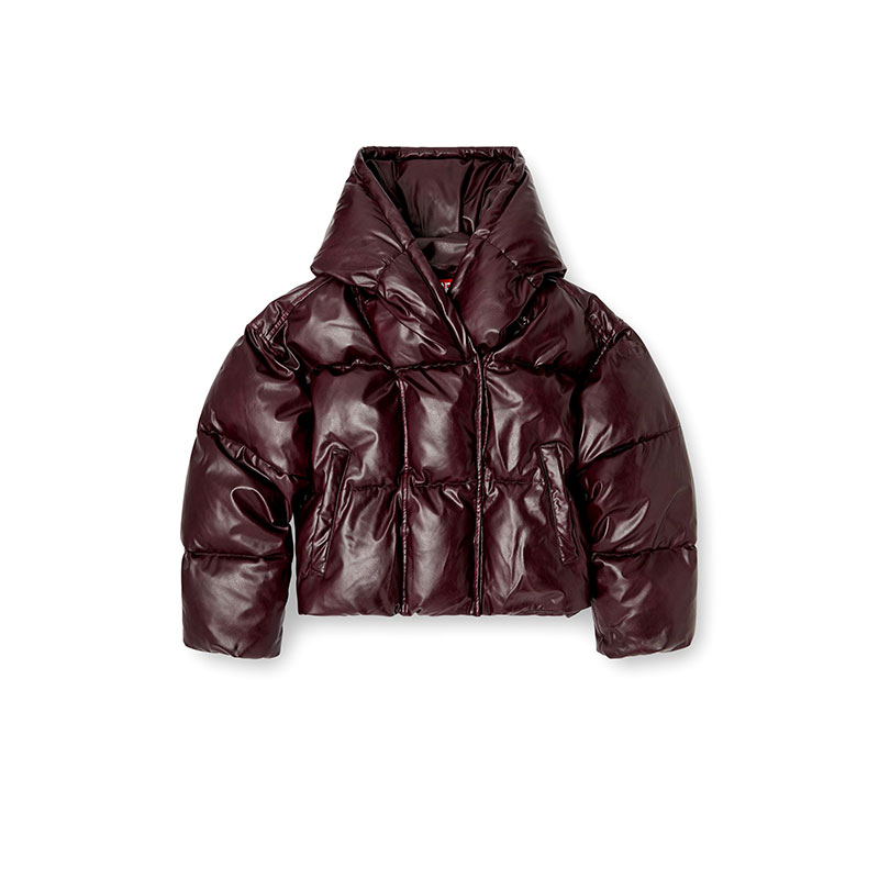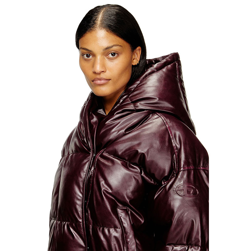 This women's puffer jacket is crafted from burgundy coated fabric, offering a unique, smooth texture that feels a bit like leather. It features a double-breasted construction with a hidden snap-button closure, a soft hood and drawstring cuffs for warmth. An embossed Oval D detail on the left sleeve subtly completes the design.