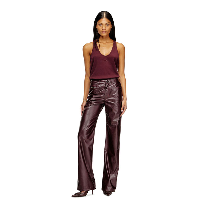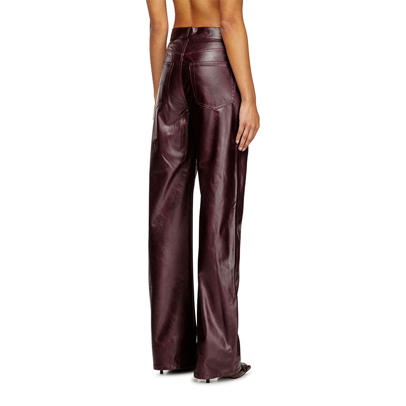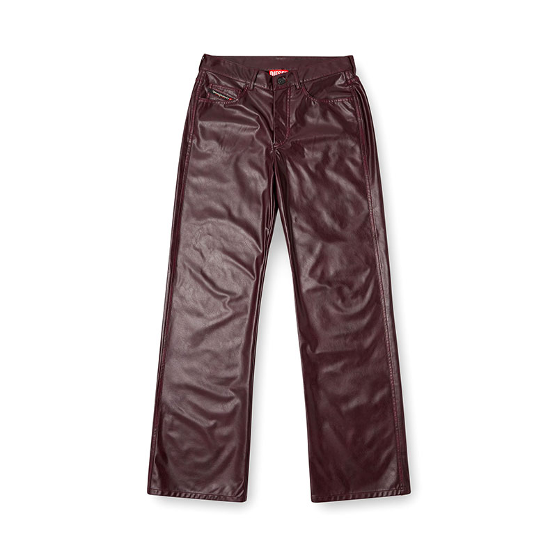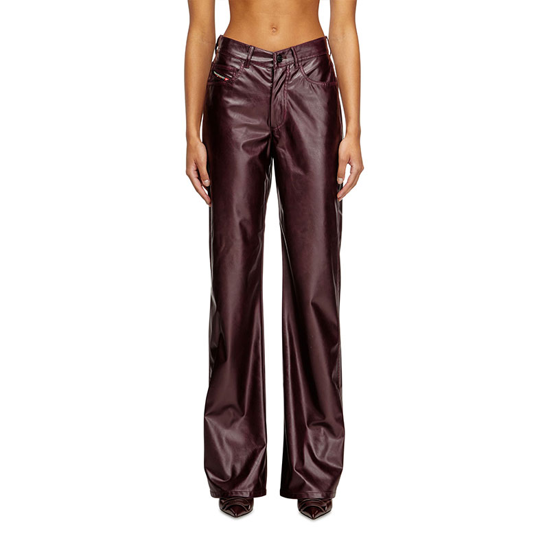 Women's five-pocket pants crafted from burgundy coated fabric, offering a unique, smooth texture that feels a bit like leather. The straight-leg silhouette is enriched with the iconic Diesel Industry logo flag, belt loops, and a metal zipper and button closure.