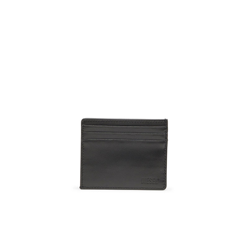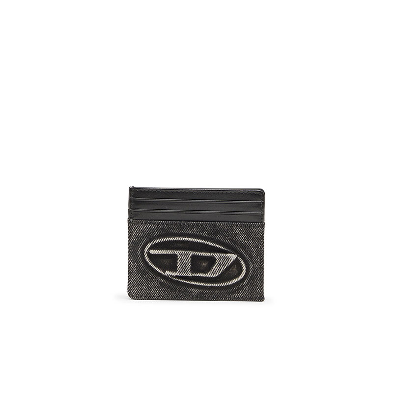 Card holder crafted from washed denim, featuring three card slots on each side, and a central flat pocket for receipts and notes. The front showcases an embossed Oval D logo, while the back is finished in smooth leather with discreet Diesel lettering.