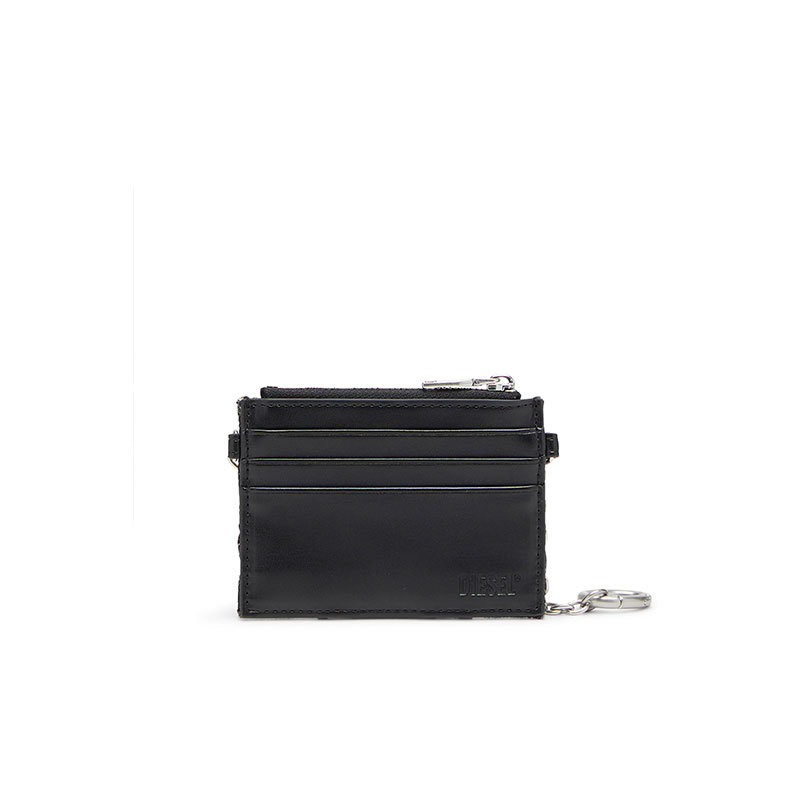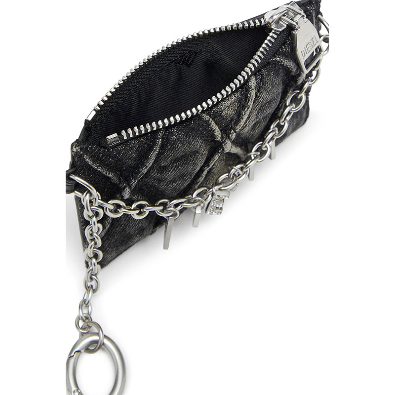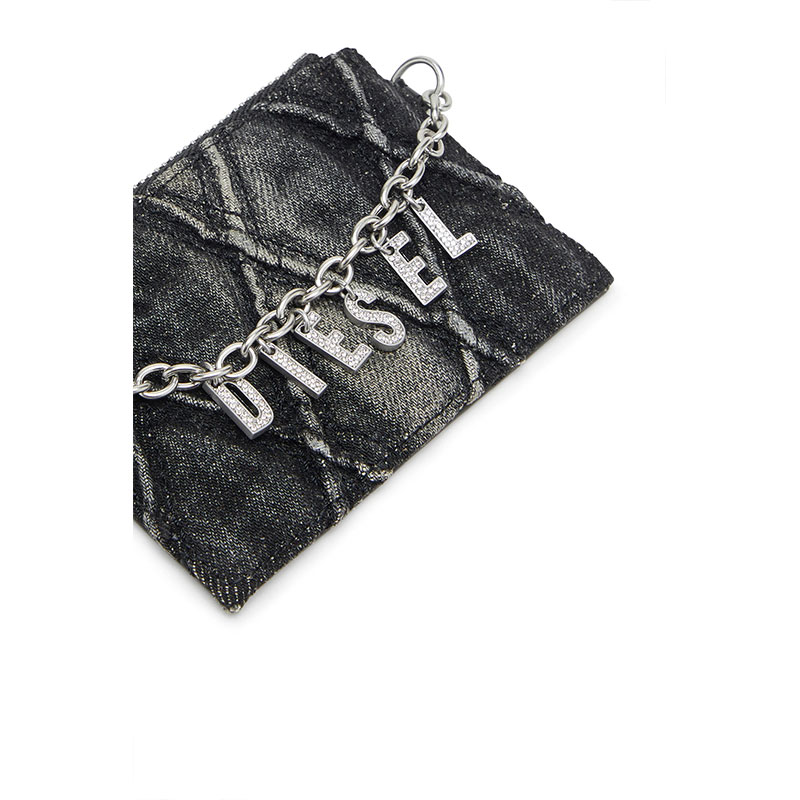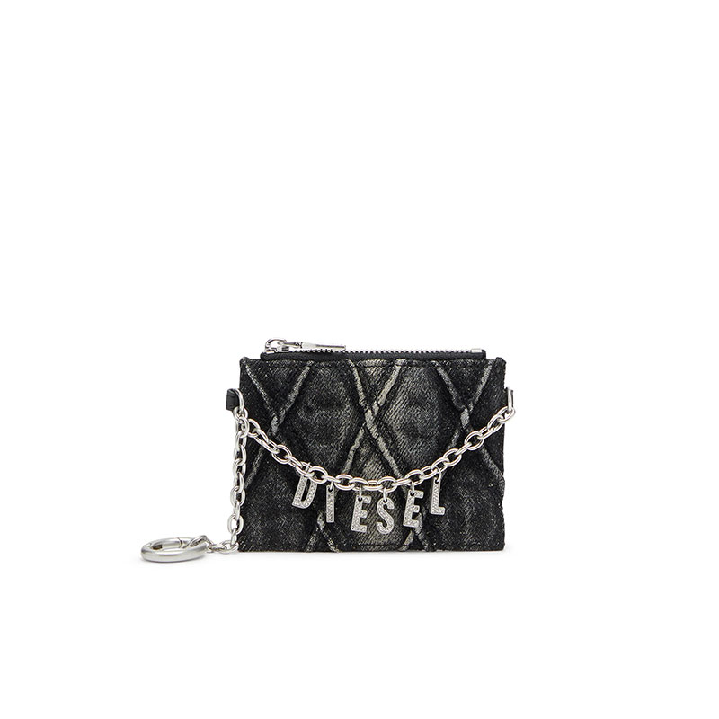 This women's card holder with chain combines practicality and style, featuring a zipped coin pocket and three card compartments on the back. Crafted from a blend of cotton and polyurethane, the design includes a signature quilted pattern, while the removable chain adorned with the Diesel lettering creates a bold statement, making it an ideal accessory for those who appreciate both fashion and function.