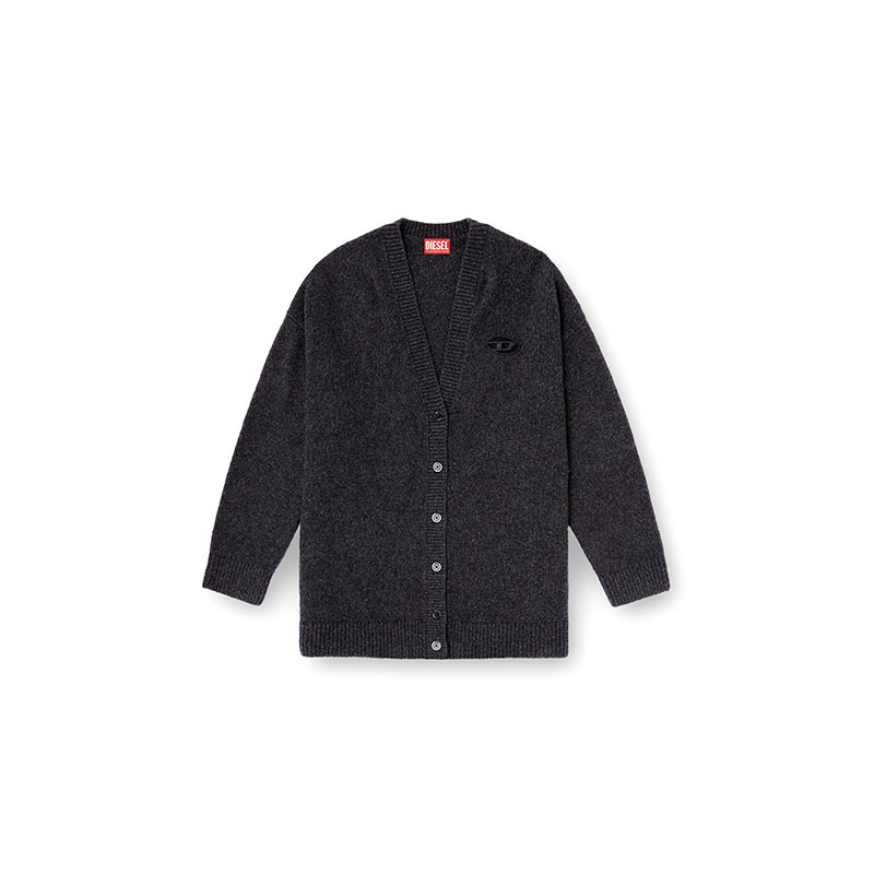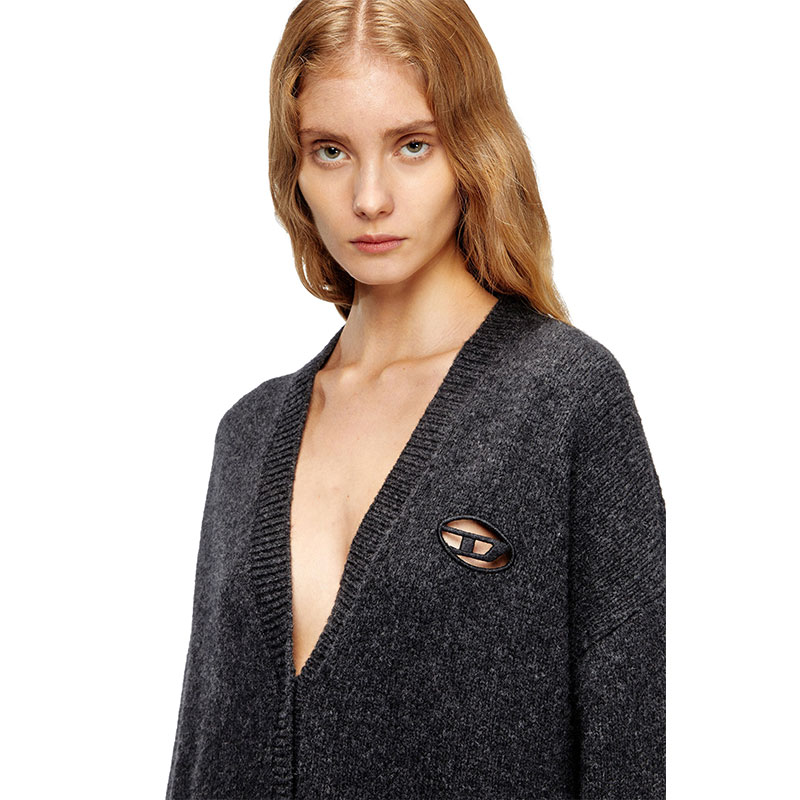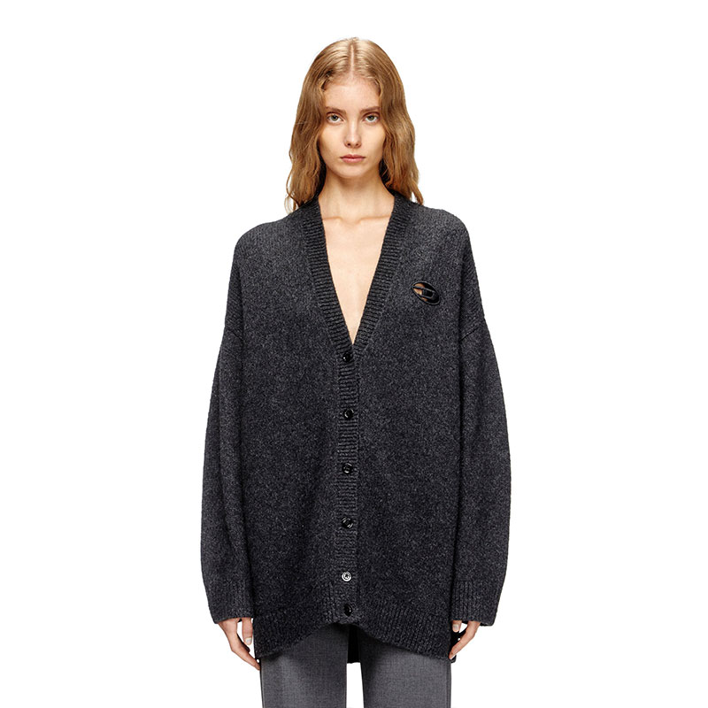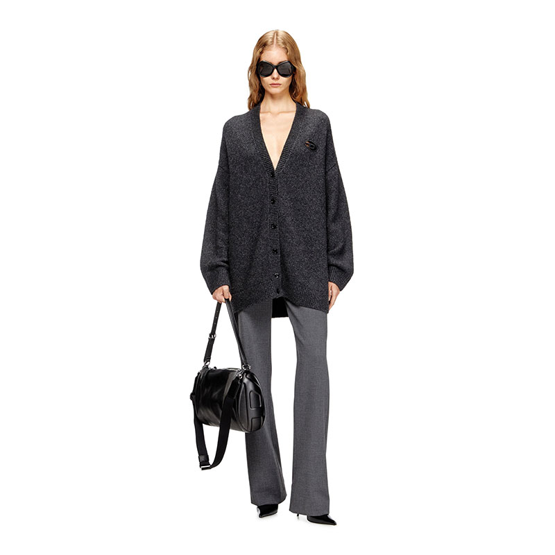 Women’s cardigan with a relaxed, drop shoulder silhouette. Spun from chunky yarn rich in responsibly sourced wool and alpaca, this style has a V-neckline and buttons down the front. The embroidered chest cut-out in the shape of the iconic Oval D adds an unconventional logo twist.