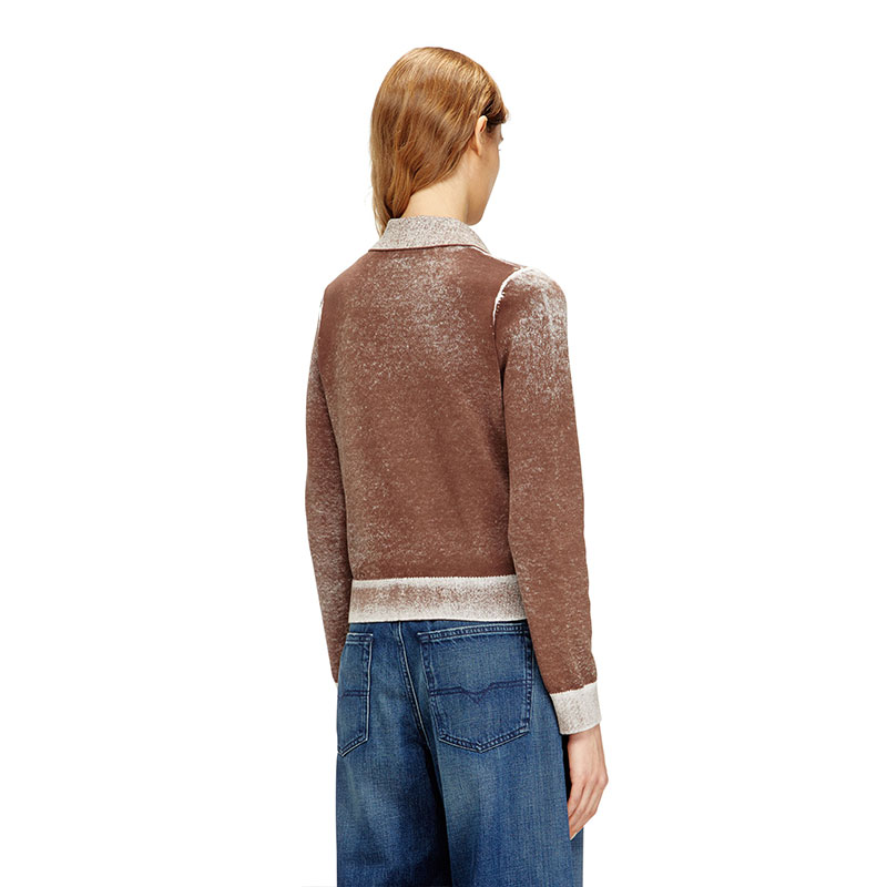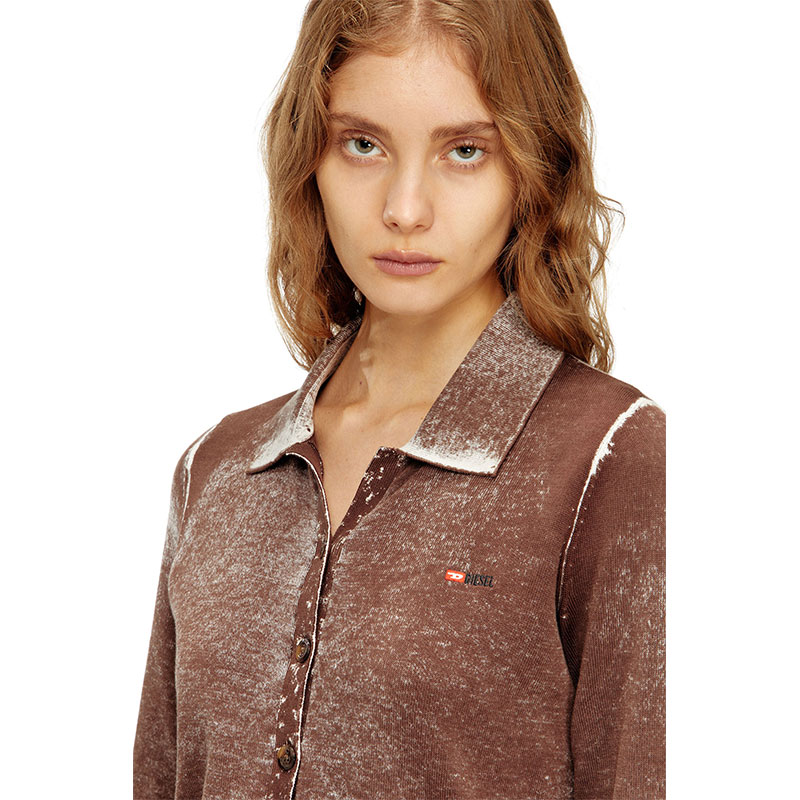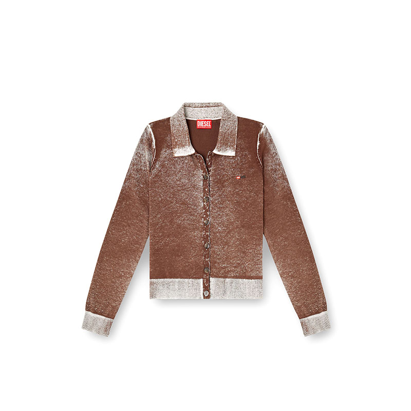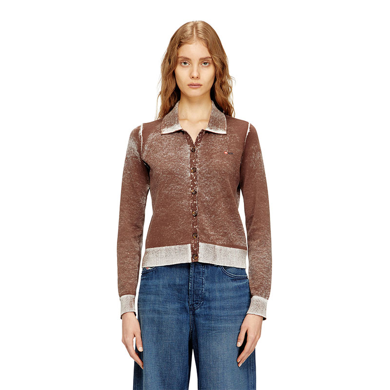 Women's cardigan with a classic collar and regular fit. Knitted from cotton, this buttoned style has been specially printed on the inside, resulting in a softened, uneven colour. The effect of this technique is particularly visible on the ribbed trims, where the tone is decidedly lighter. A micro-sized embroidered logo accents the chest.