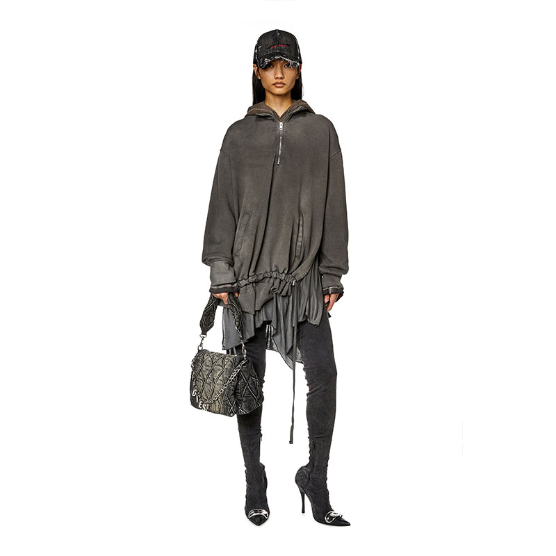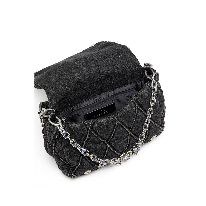 This women's handbag is made from quilted black denim with a treated finish. The front flap opens up to a single compartment with an internal zipped pocket. The bag features a soft denim handle and a longer denim and chain strap in matte silver-tone metal, adorned with rhinestone Diesel letter charms that can be draped across the front. The chain also doubles as a bracelet.