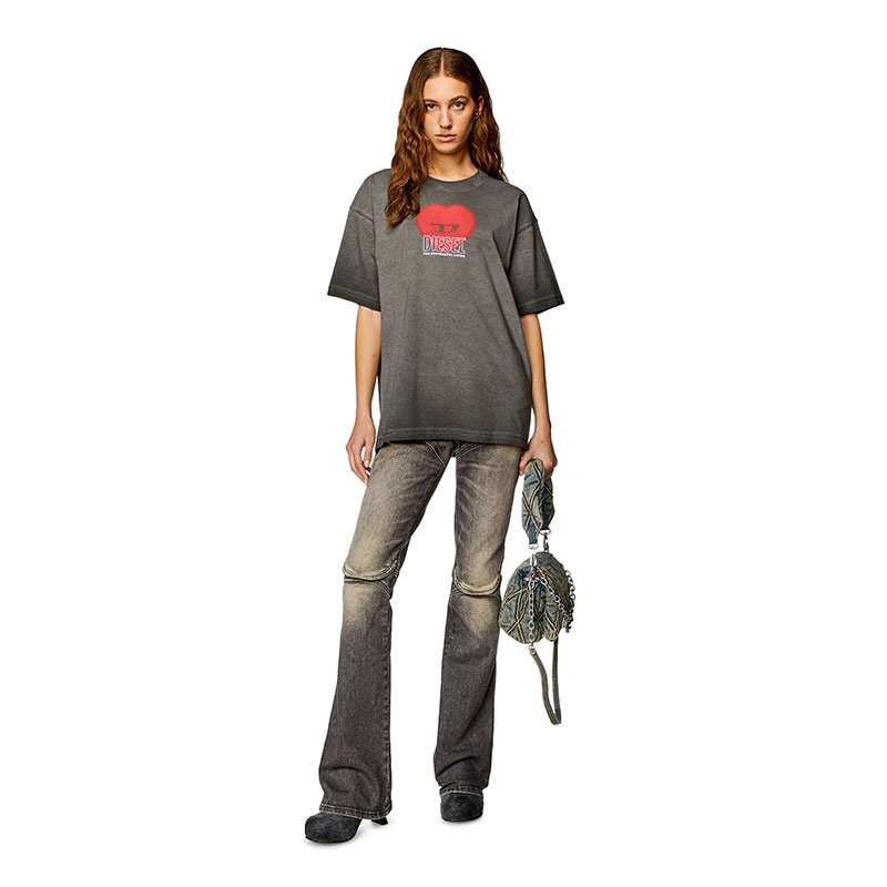 Compact women's handbag made from quilted light blue denim, topped with a matching handle. The accessory features a flap closure, an internal zipped pocket, and a metal Diesel lettering chain.