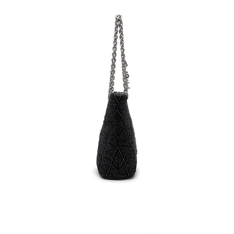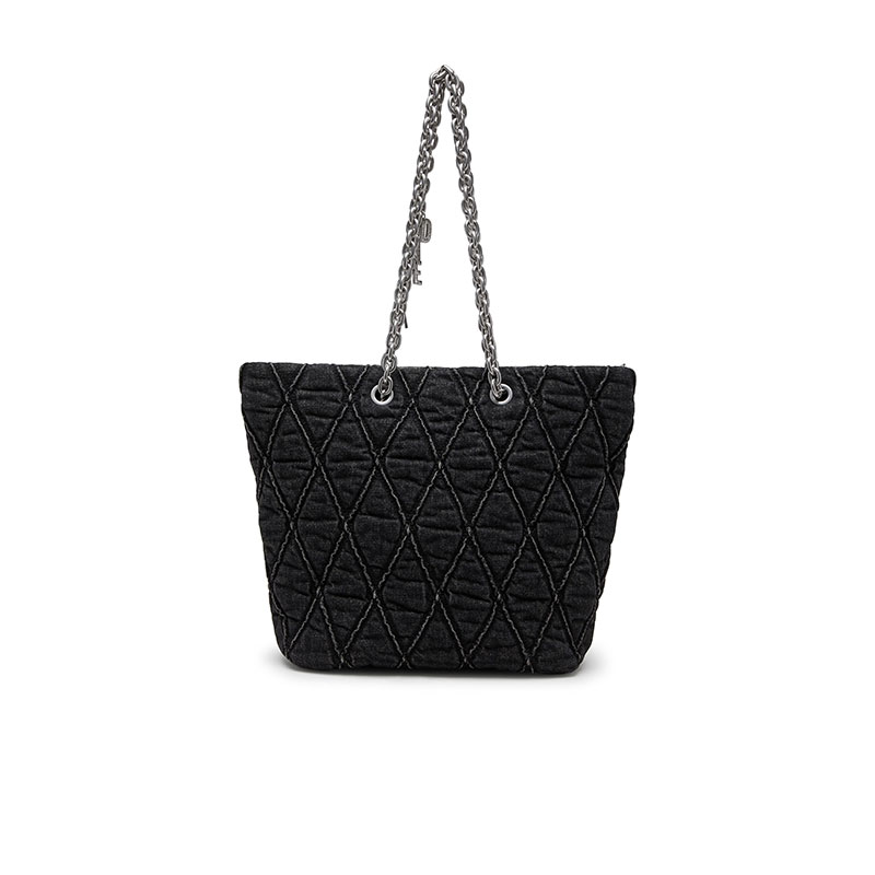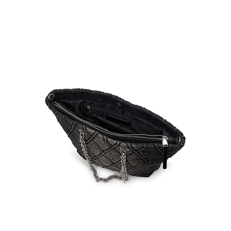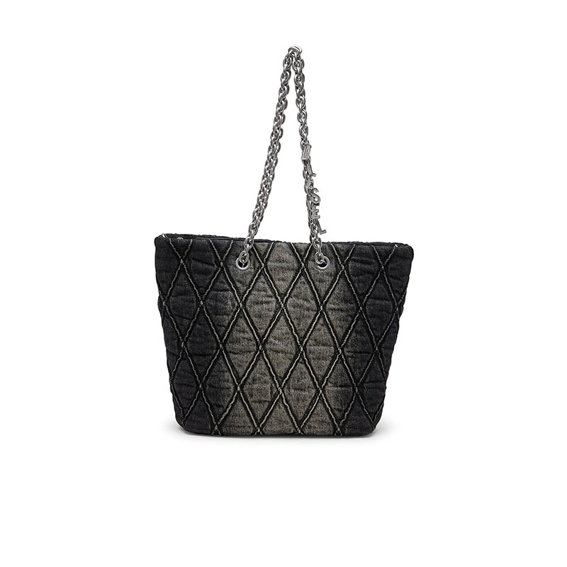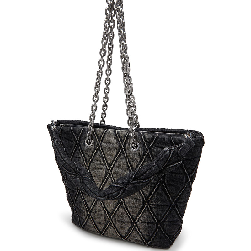 This women’s shopping bag is a cleverly organised carry-all, roomy enough for a 13″ laptop. Featuring three internal compartments, including one secured with a zip, it’s made from faded black denim with a quilted diamond pattern – one of Diesel’s most recognisable textures. Long chain handles sparkle with crystal-studded logo charms, while a padded strap lets you tuck it neatly under the arm.