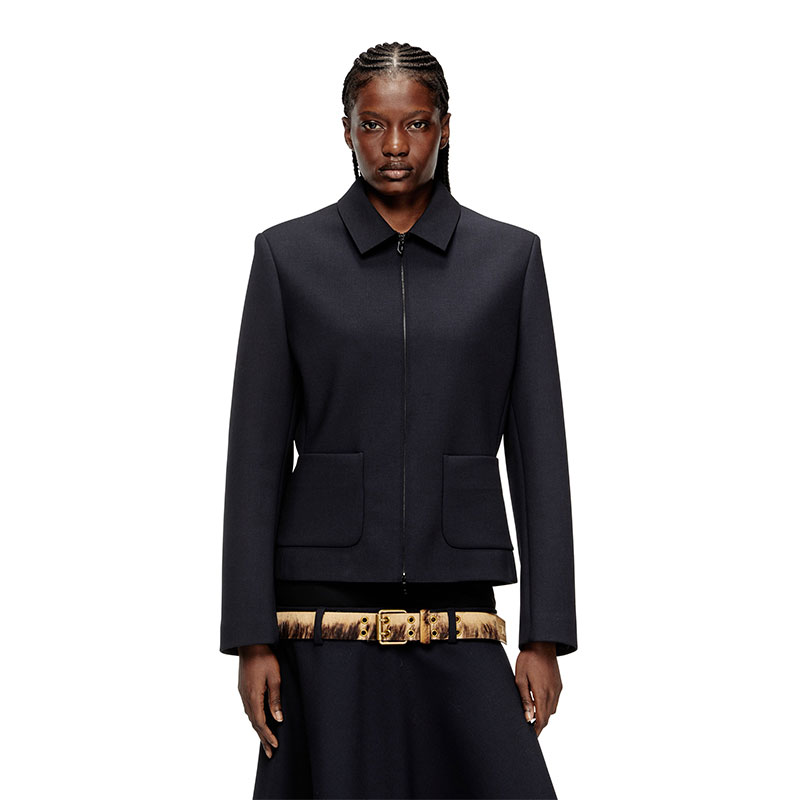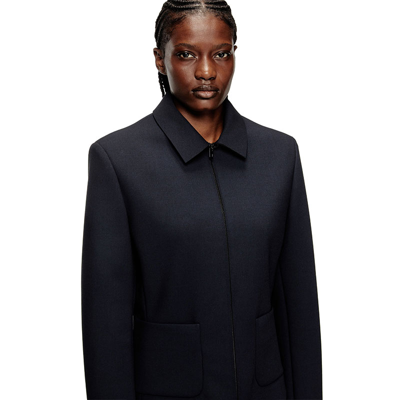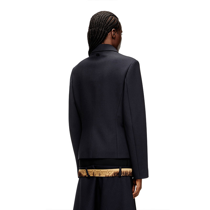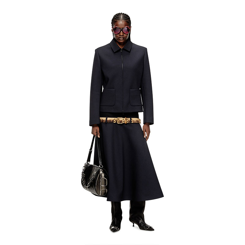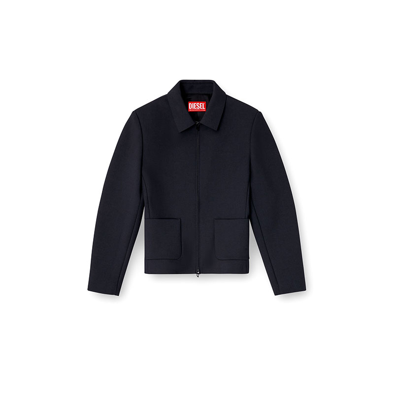 This women’s collared jacket from the FW25 Runway Show collection is a Diesel take on severe tailoring. Structured with defined shoulders and waist, the sharp and minimal bonded neoprene construction is complete with two patch pockets and a two-way zip fastening. A discreet metal Oval D logo hallmarks the back.