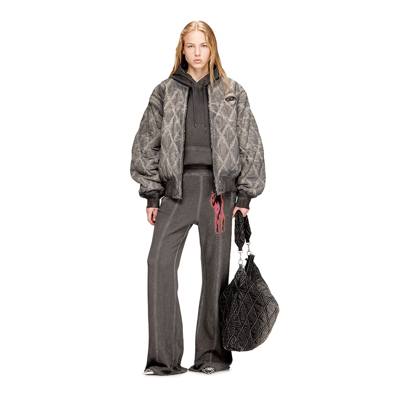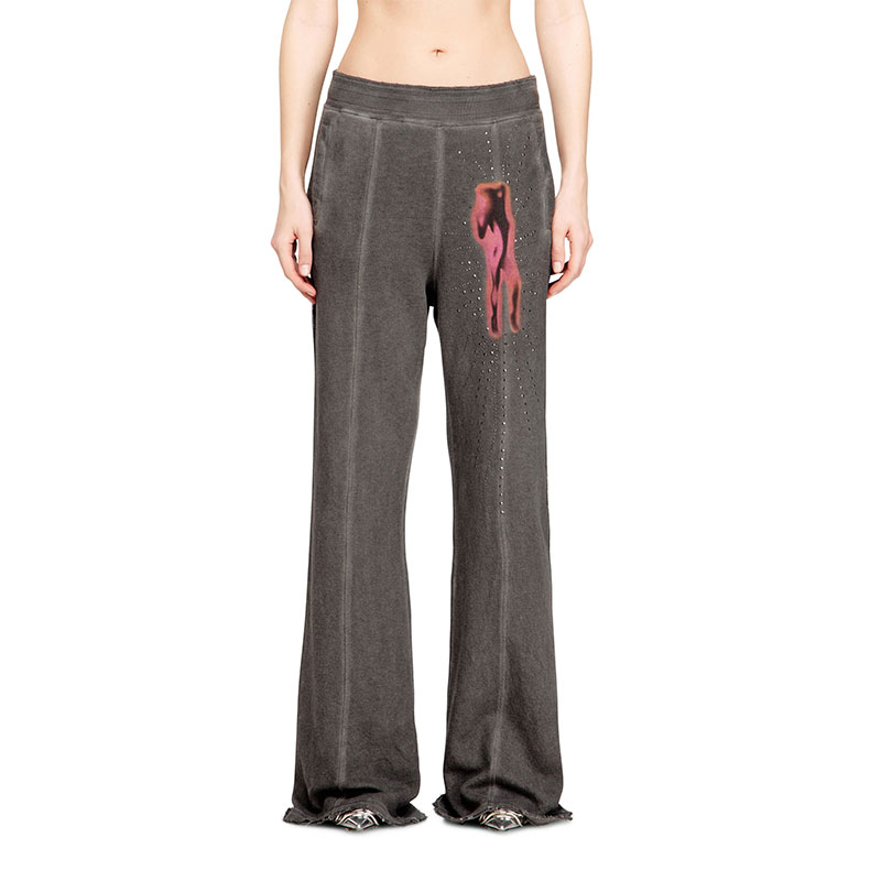 Women's regular-fit sweatpants, crafted from organic cotton fabric with a melange effect and cold pigment-dye treatment. The wide-fit style features an elastic waistband with a branded cotton drawstring, and raw-edge details along the edges. Embellished with a tonal Oval D with rhinestones on the back welt pocket, and a digital print with studs on the front for a bold touch.