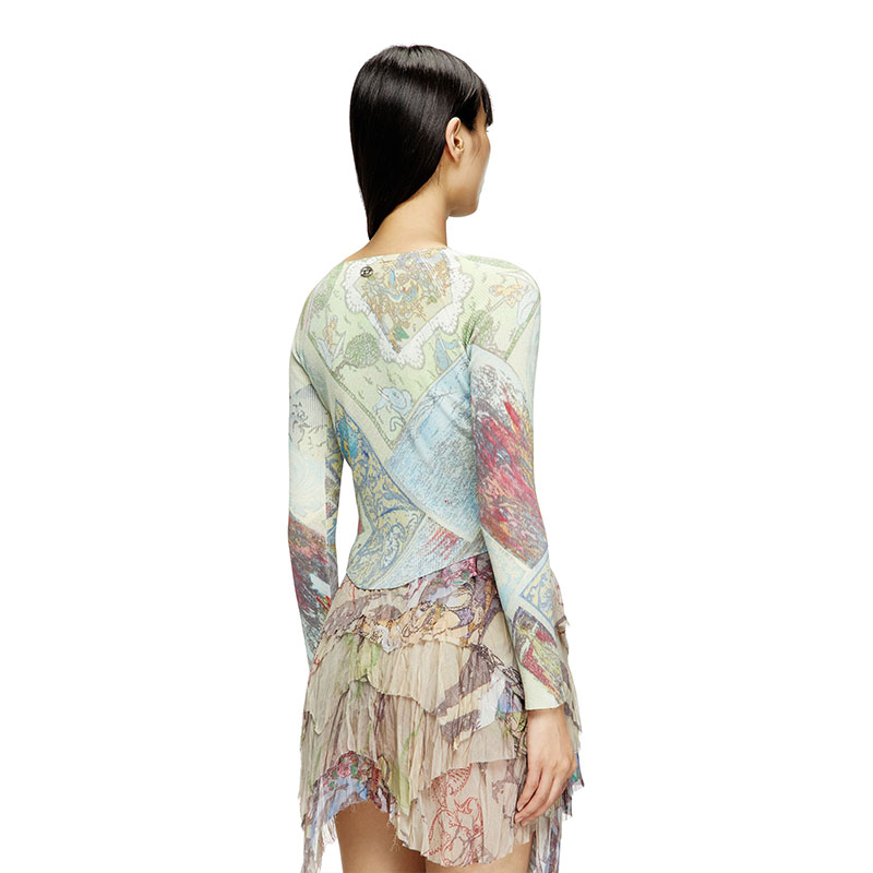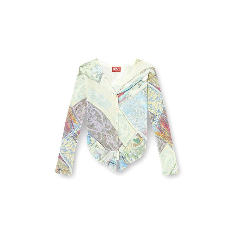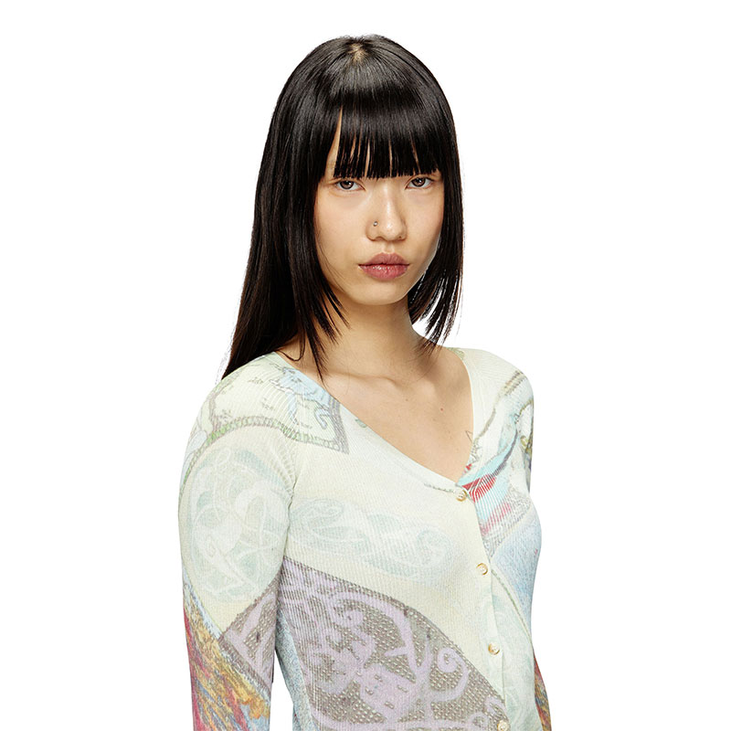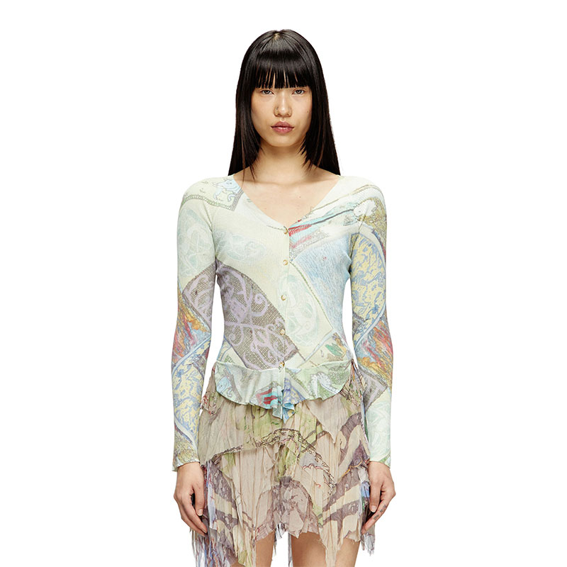 Part of an artistic collaboration, this women's cotton-blend cardigan is printed all-over with medieval-inspired graphic artwork. Featuring a V-neck and cropped length, it's made from a fine ribbed knit and has a floaty plain-knit trim at the front of the hem.