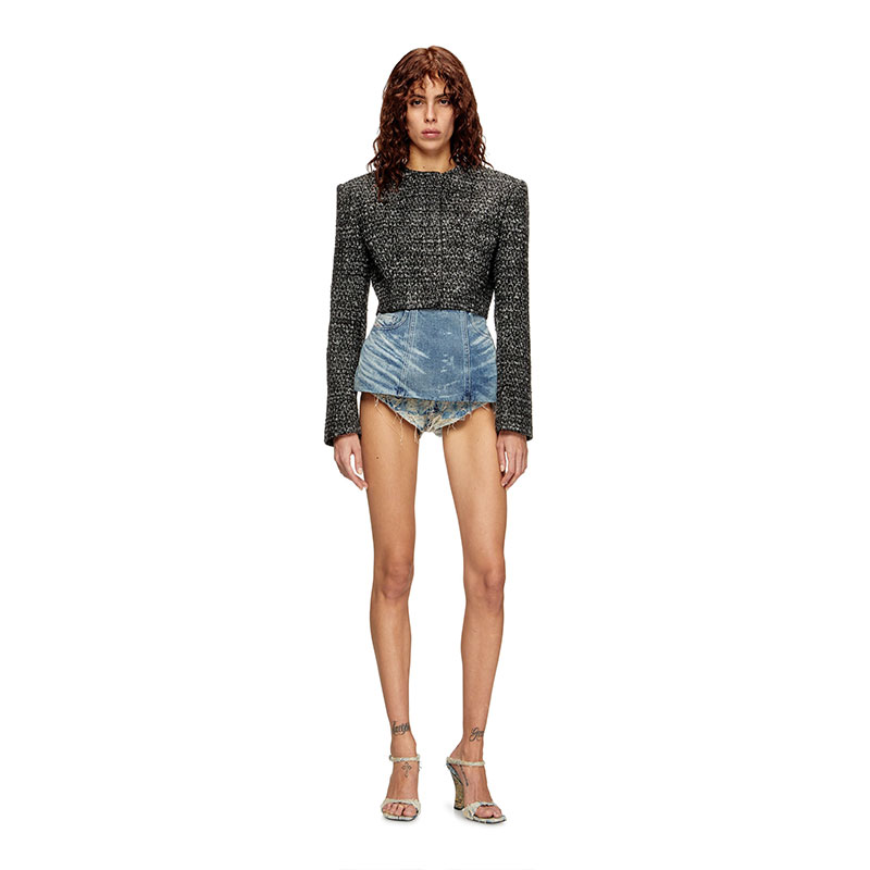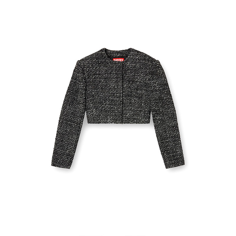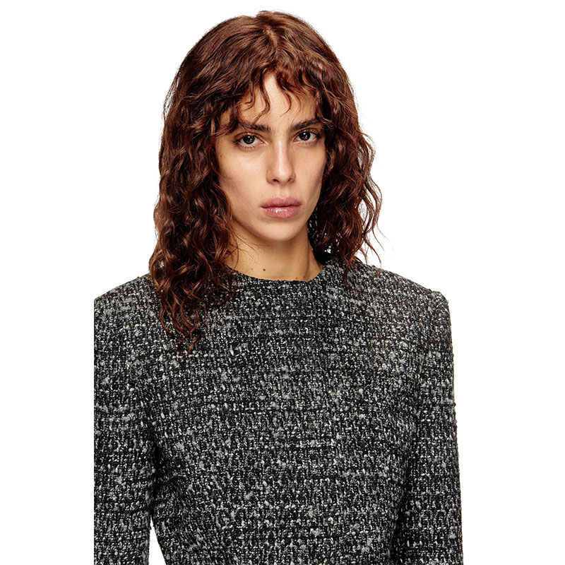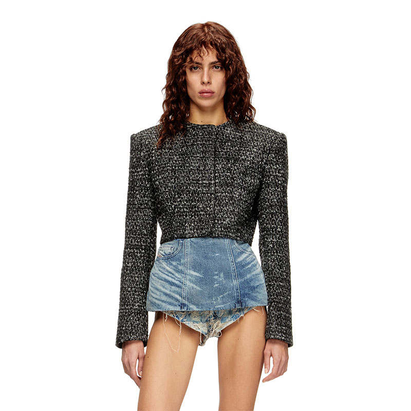The looped texture of quintessential bouclé tweed softens the severe lines of this women's jacket. Straight off the Fall Winter 2025 Runway, it's clean-cut, boxy at the shoulders, cropped at the waist and completely unadorned. A hidden closure keeps things impossibly sleek.