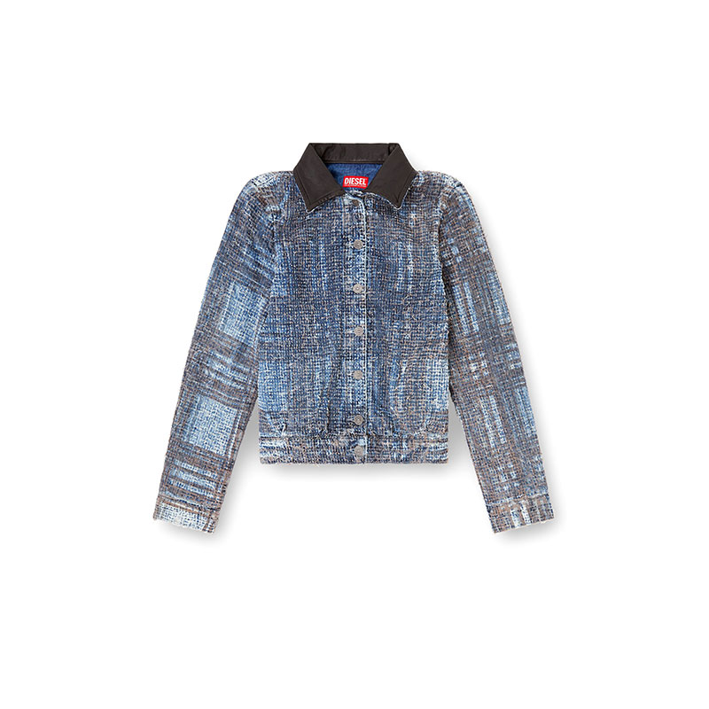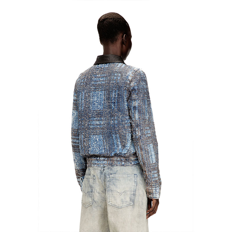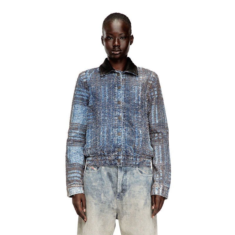Women's jacket cut to a slightly cropped silhouette with a fitted back hem and a contrasting leather collar. Defined by a graphic, tactile look, this medium blue wash is made from organic-cotton fix denim. The bouclé texture is crafted using an elaborate needlepunch technique, lending the fabric a uniquely distressed finish. Enriched with a Prince of Wales print, it's a perfect example of Diesel's alternative vision of classic tailoring staples.