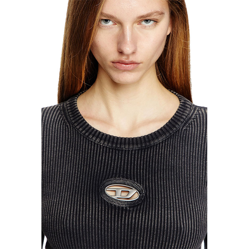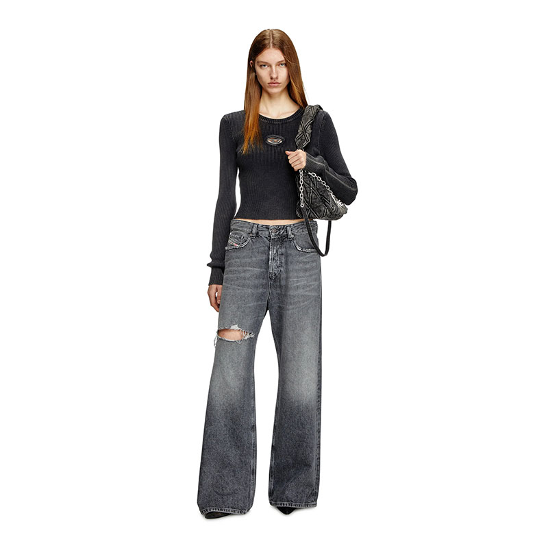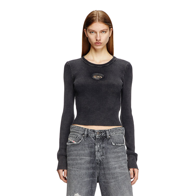 Women’s cropped sweater spun with organic cotton. Rib-knitted for a close fit using black denim yarn, it shows a natural, lived-in fade and distinctive logo detail – the metal Oval D plaque nestled in the chest cut-out creates a peekaboo effect, allowing for a flash of skin.