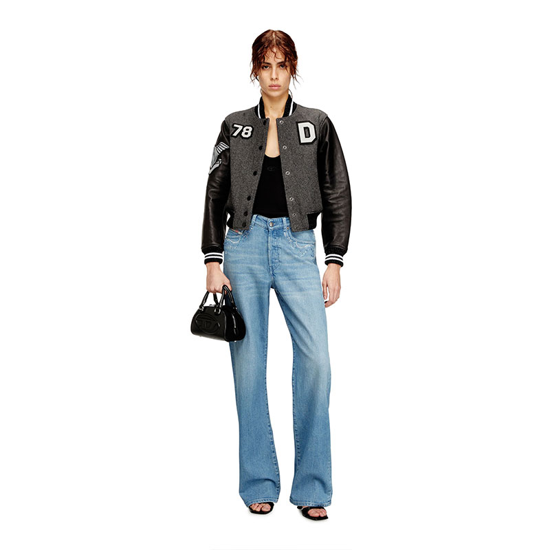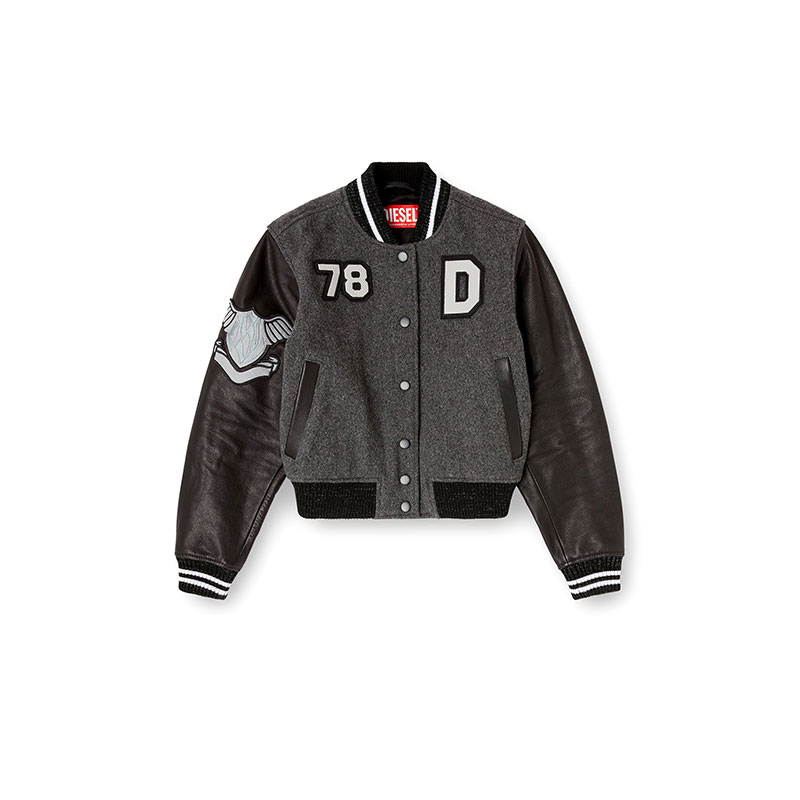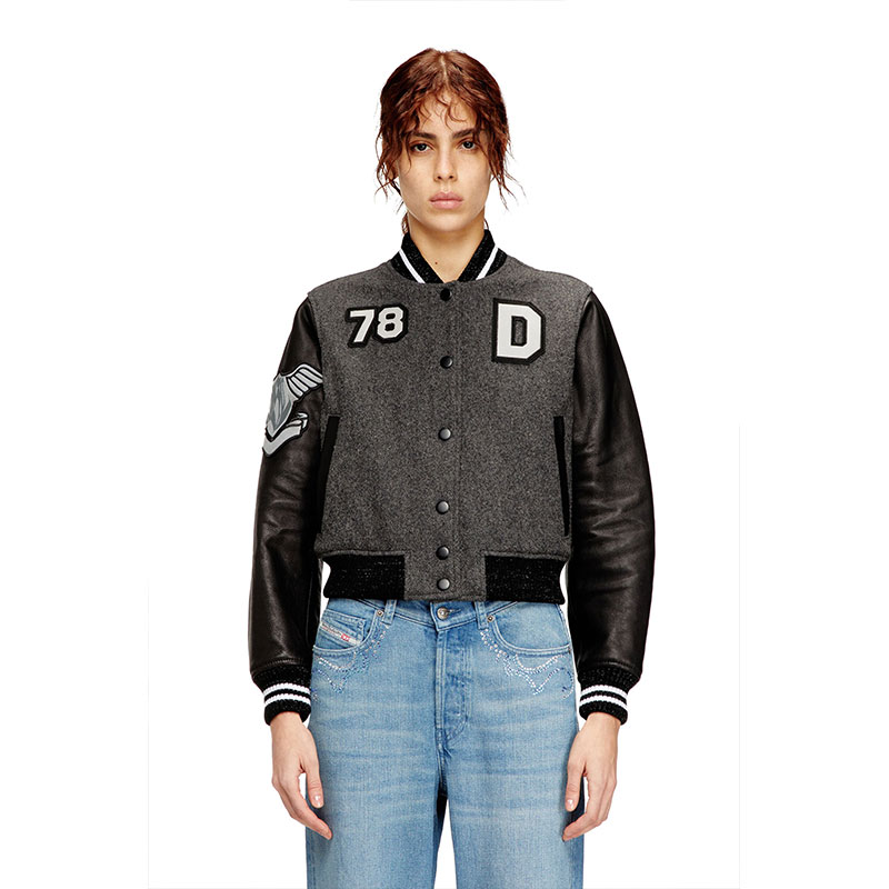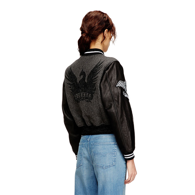 Women's cropped varsity jacket crafted from a wool blend and embellished with a Phoenix embroidery and multiple logo-inspired patches on the front, back, and on the leather sleeves. Complete with ribbed neck and cuffs, wool patches, and a lightly padded satin lining.