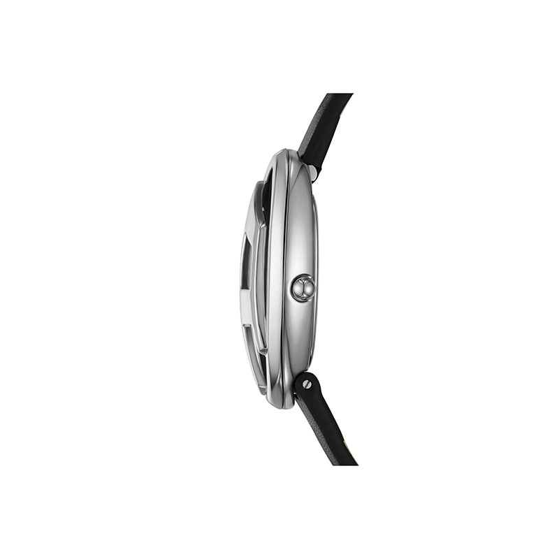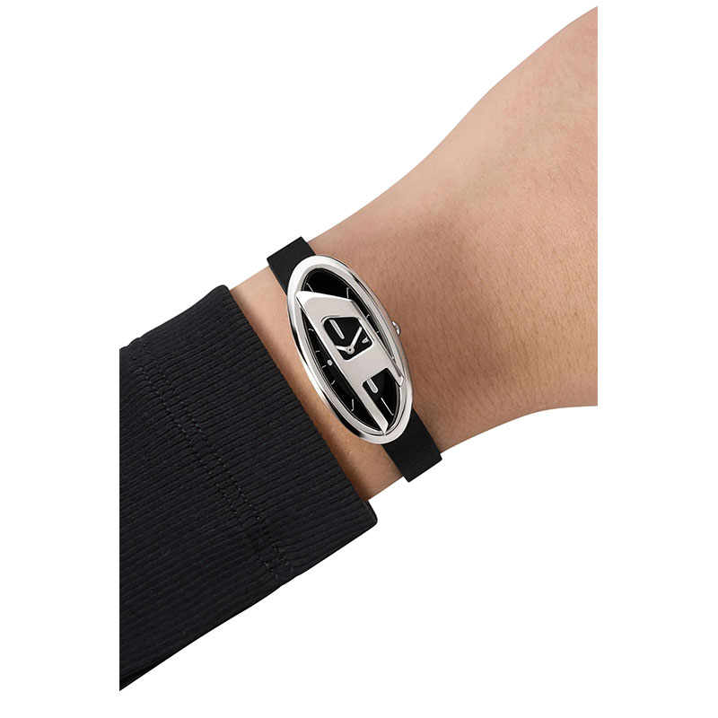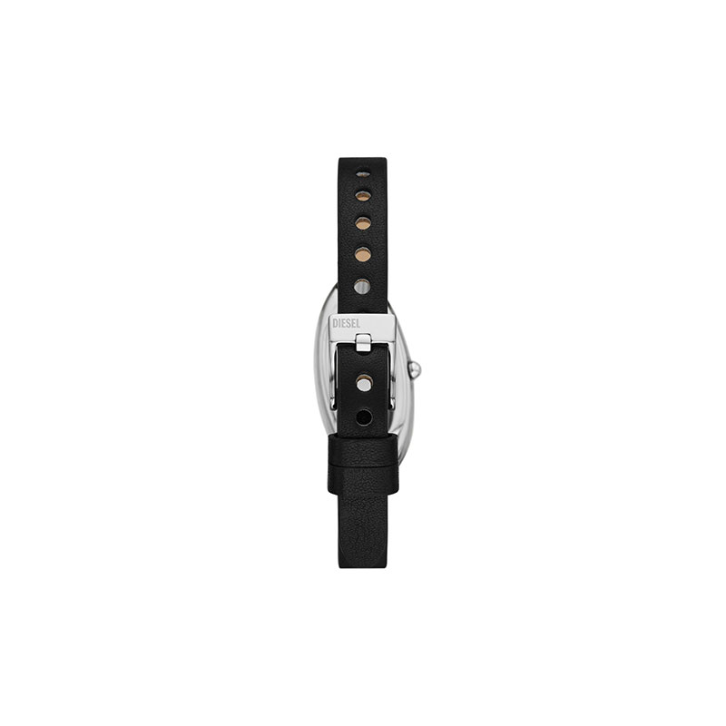 Diesel's 19mm D-Era watch features a black dial, two-hand movement and black leather strap.