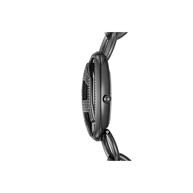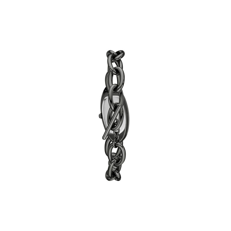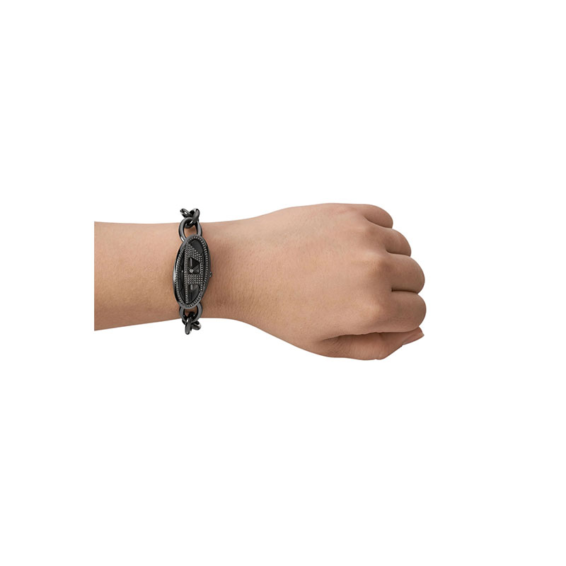 Diesel's 19mm D-Era watch features a black polished sunray dial, two-hand movement and gunmetal stainless steel bracelet with pave details.